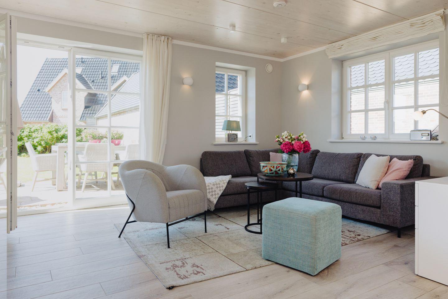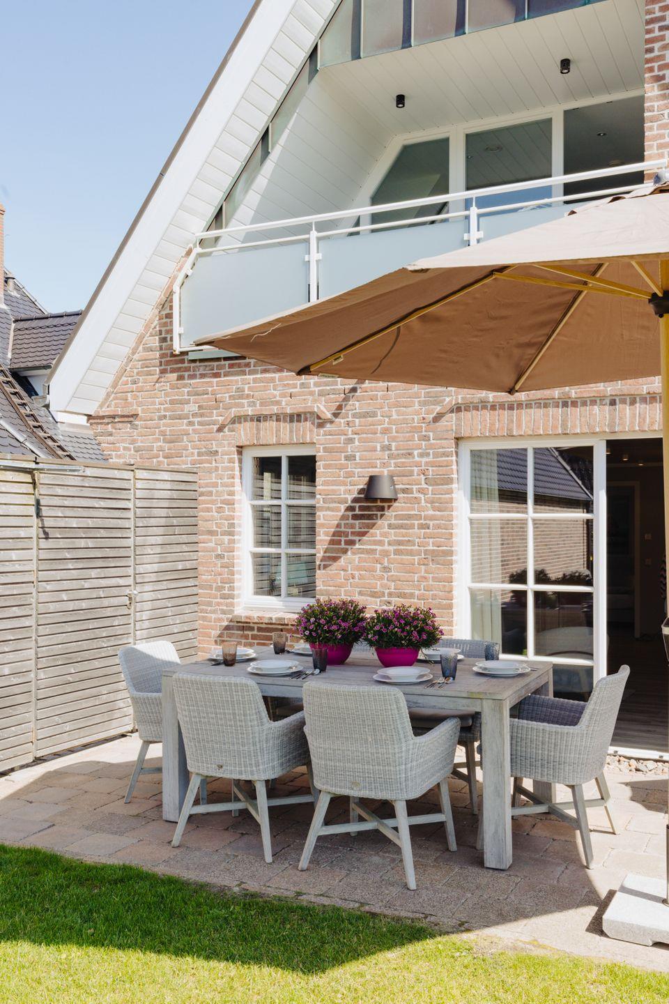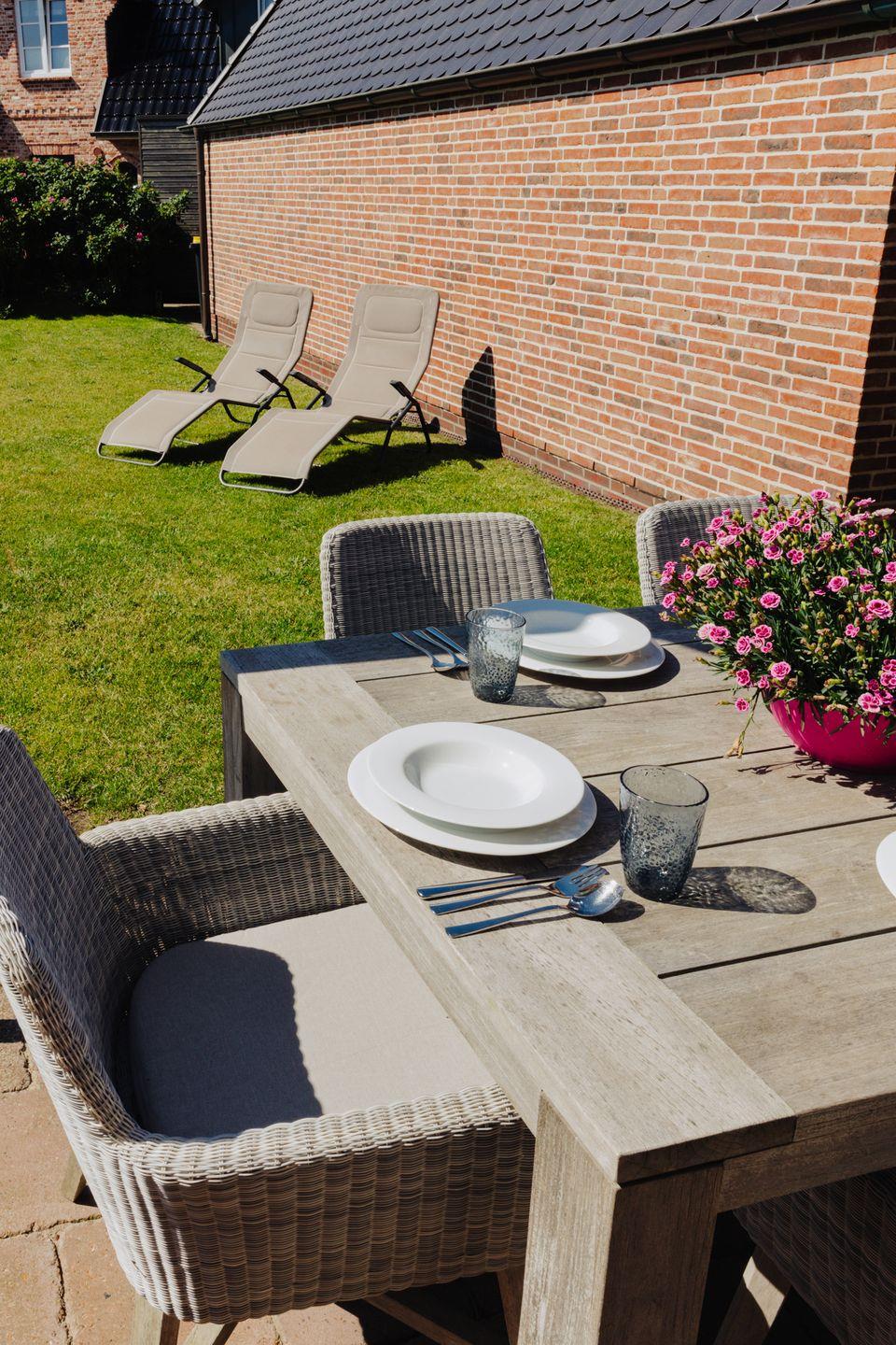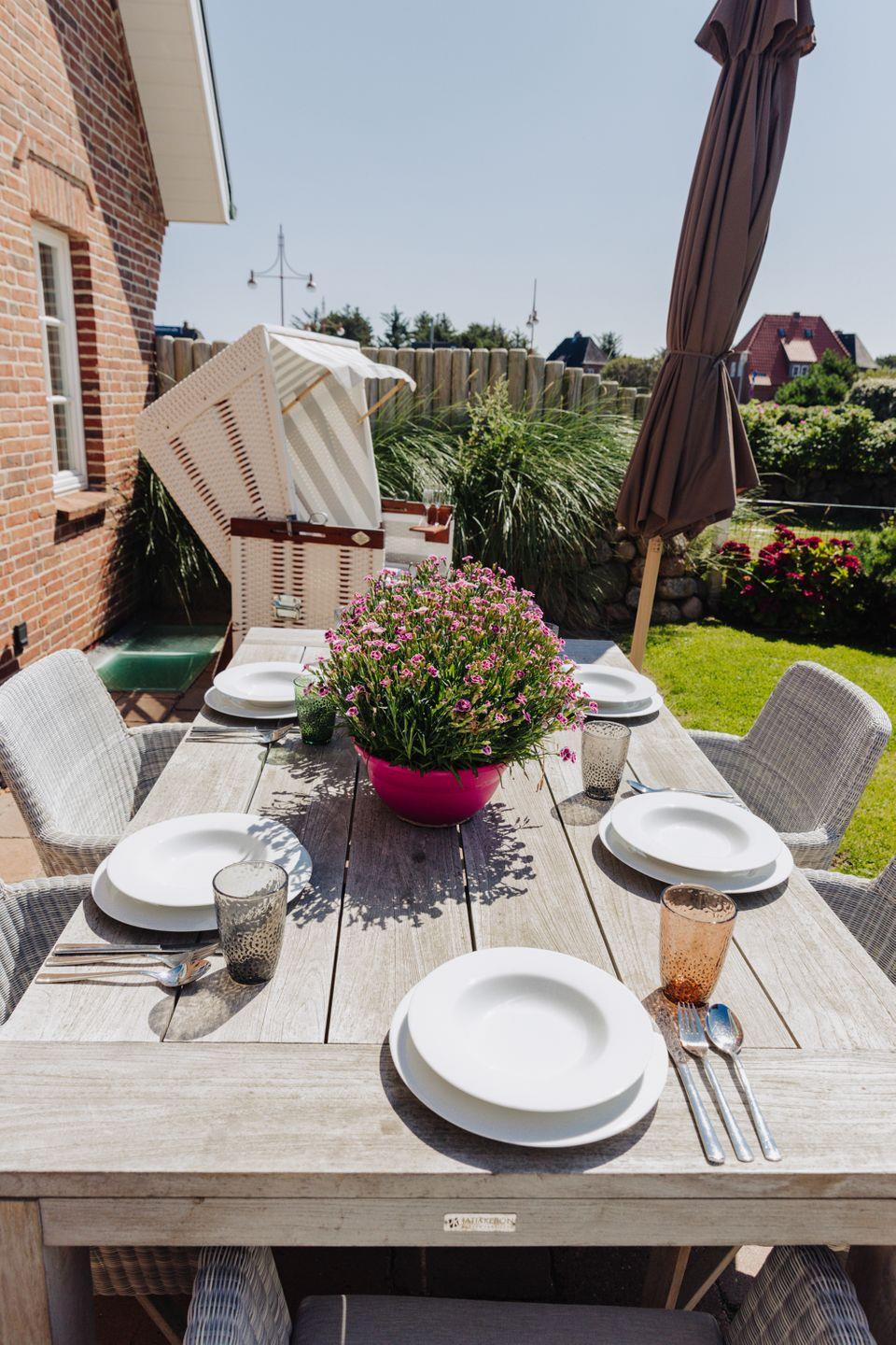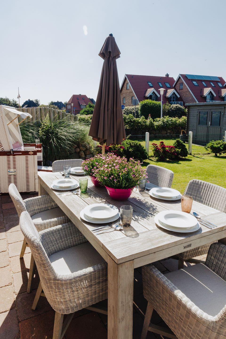 Genießen Sie sonnige Stunden auf Ihrer Südterrasse oder entspannen Sie im idyllischen Garten mit Gartenmöbeln und einem privaten Strandkorb.
