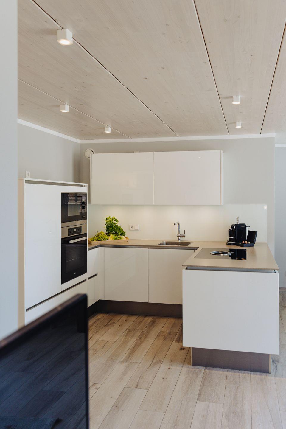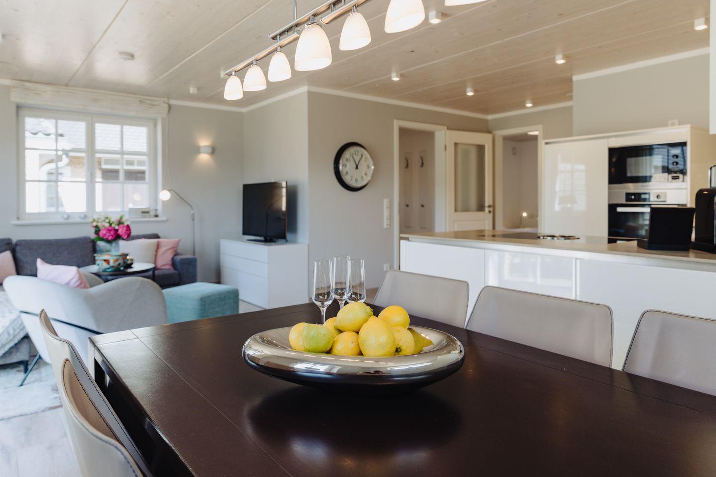 Die moderne, separate Küche ist bestens ausgestattet und macht die Selbstversorgung zum Vergnügen. Im angrenzenden Wohn- und Essbereich laden gemütliche Möbel zum Entspannen und geselligen Beisammensein ein.