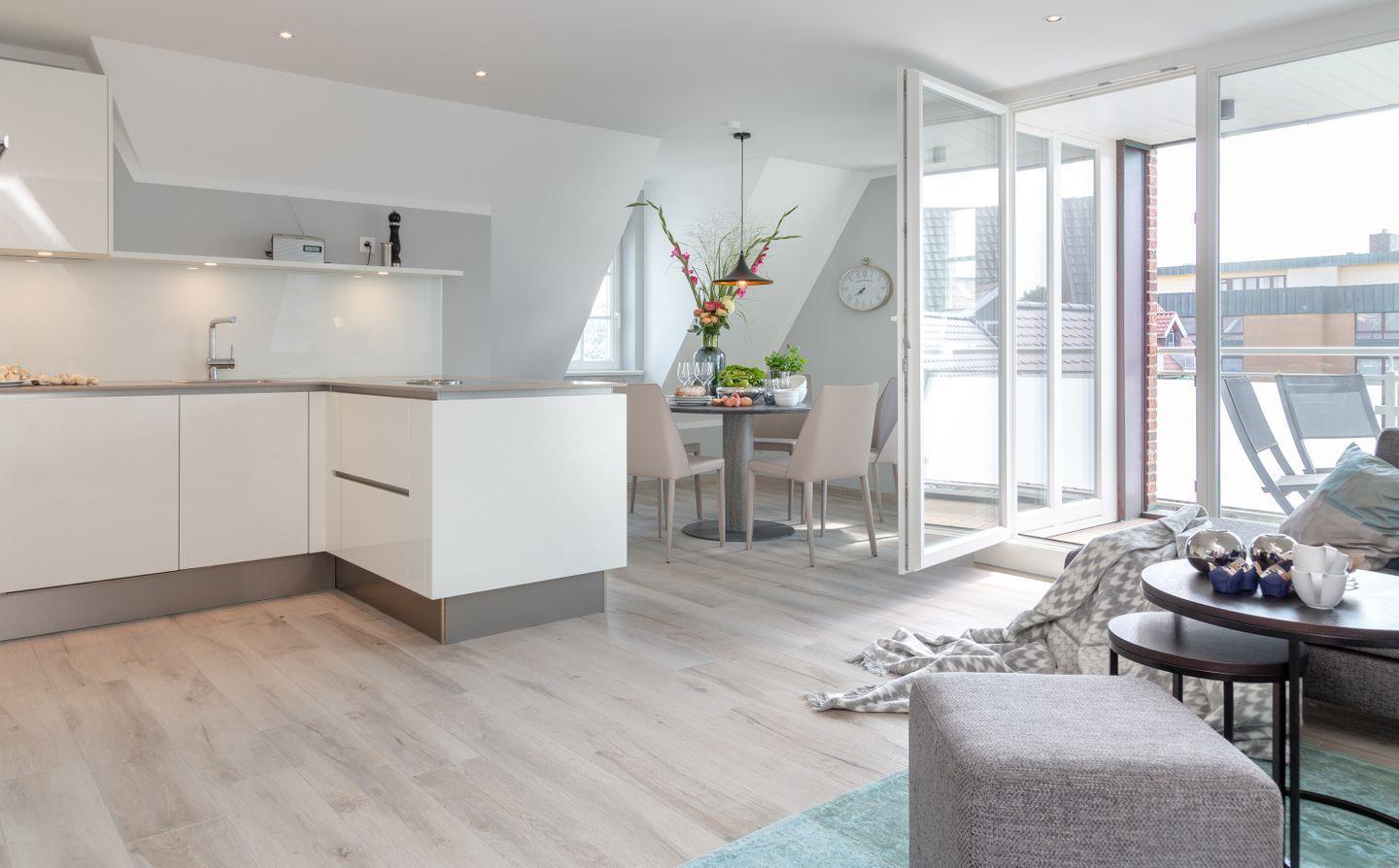 Der großzügige und gemütliche Wohn- und Essbereich bildet das Zentrum der Wohnung und lädt mit seinen komfortablen Möbeln zu geselligen Momenten und entspannten Stunden ein. Vom Wohnbereich gelangen Sie direkt auf Ihren sonnigen, windgeschützten Südbalkon – ideal, um die Sylter Sonne zu genießen.