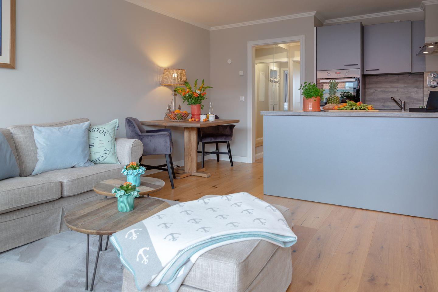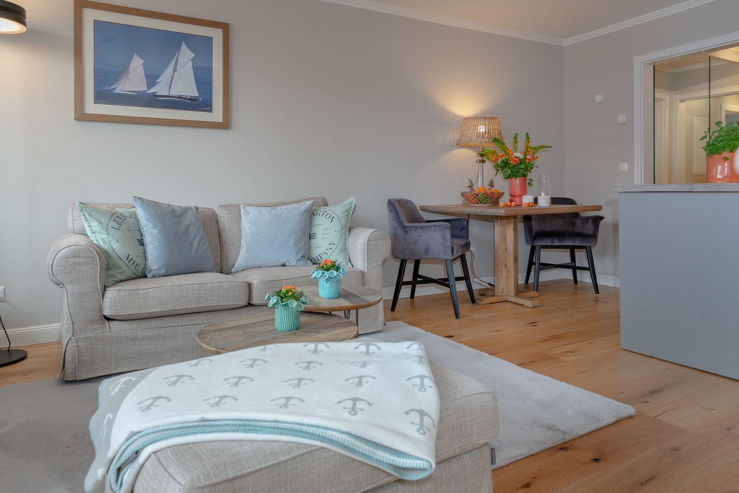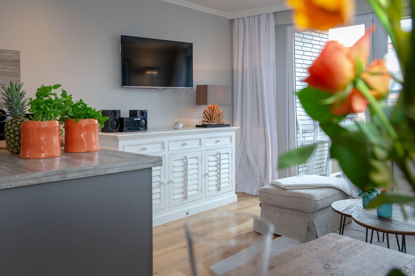 Genießen Sie hier eine unvergessliche Zeit inmitten des Herzens Westerlands und tauchen Sie ein in das schillernde Leben unserer Insel-Metropole. Ihr Appartement ist mit viel Liebe und exklusivem Geschmack eingerichtet, welcher durch das edle Eichenparkett noch unterstrichen wird. Der behagliche Wohn / und Essbereich bietet Ihnen eine bequeme Sofalandschaft zum Entspannen und den direkten Zugang zu Ihrem, nach Süden ausgerichteten Balkon mit Blick auf die bekannte Friedrichstraße und auf die wundervolle Nordsee! Hier können Sie, geschützt vor dem Sylt-typischen Nordwind, Ihre persönlichen Sonnenstunden verbringen. An den Essbereich grenzt die hochwertig und vollständig ausgestattete Küche, in der Sie die Selbstverpflegung im Urlaub zum Vergnügen werden lassen können. In Ihrem Schlafzimmer nächtigen Sie in einem komfortablen Boxspringbett, das Ihnen einen geruhsamen Schlaf garantiert. Selbstverständlich finden Sie hier auch genügend Stauraum für Ihre Garderobe vor. Die dezente Farbgestaltung und das edle Design im Badezimmer mit bodentiefer Dusche garantiert Ihnen eine Wohlfühl-Zone, in der Sie den Alltagsstress hinter sich lassen können. Die Ferienwohnung befindet sich in der vierten Etage, welche über einen Fahrstuhl bequem zu erreichen ist und somit für Sie keine Unannehmlichkeiten entstehen. Waschmaschine und Trockner befinden sich im Gemeinschaftsraum.