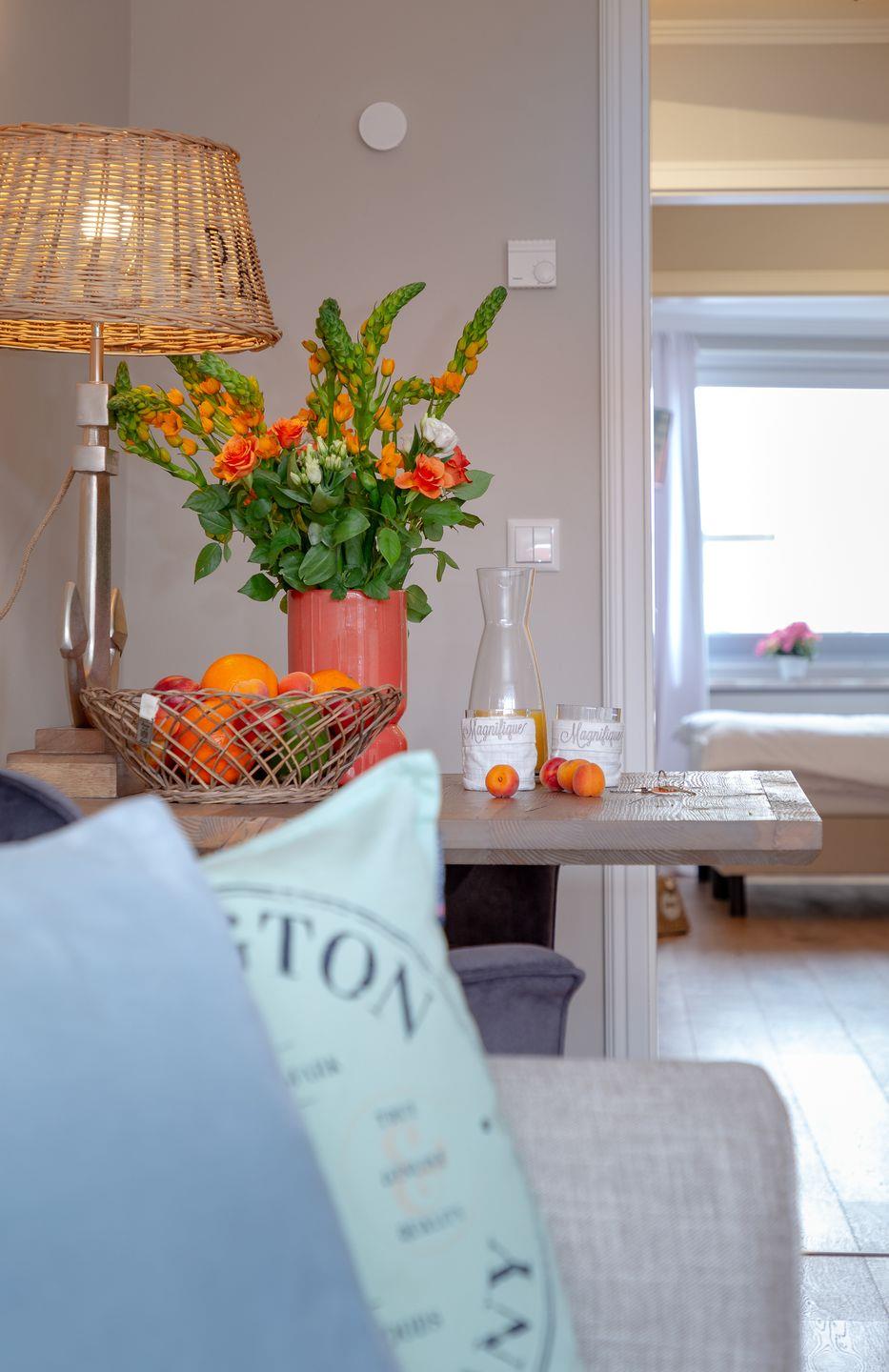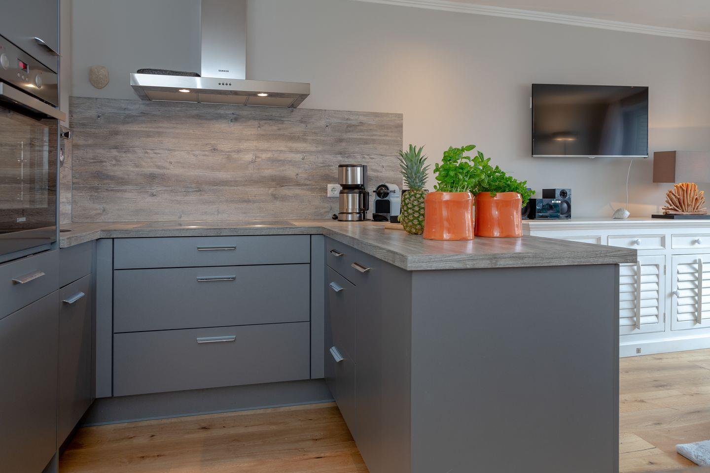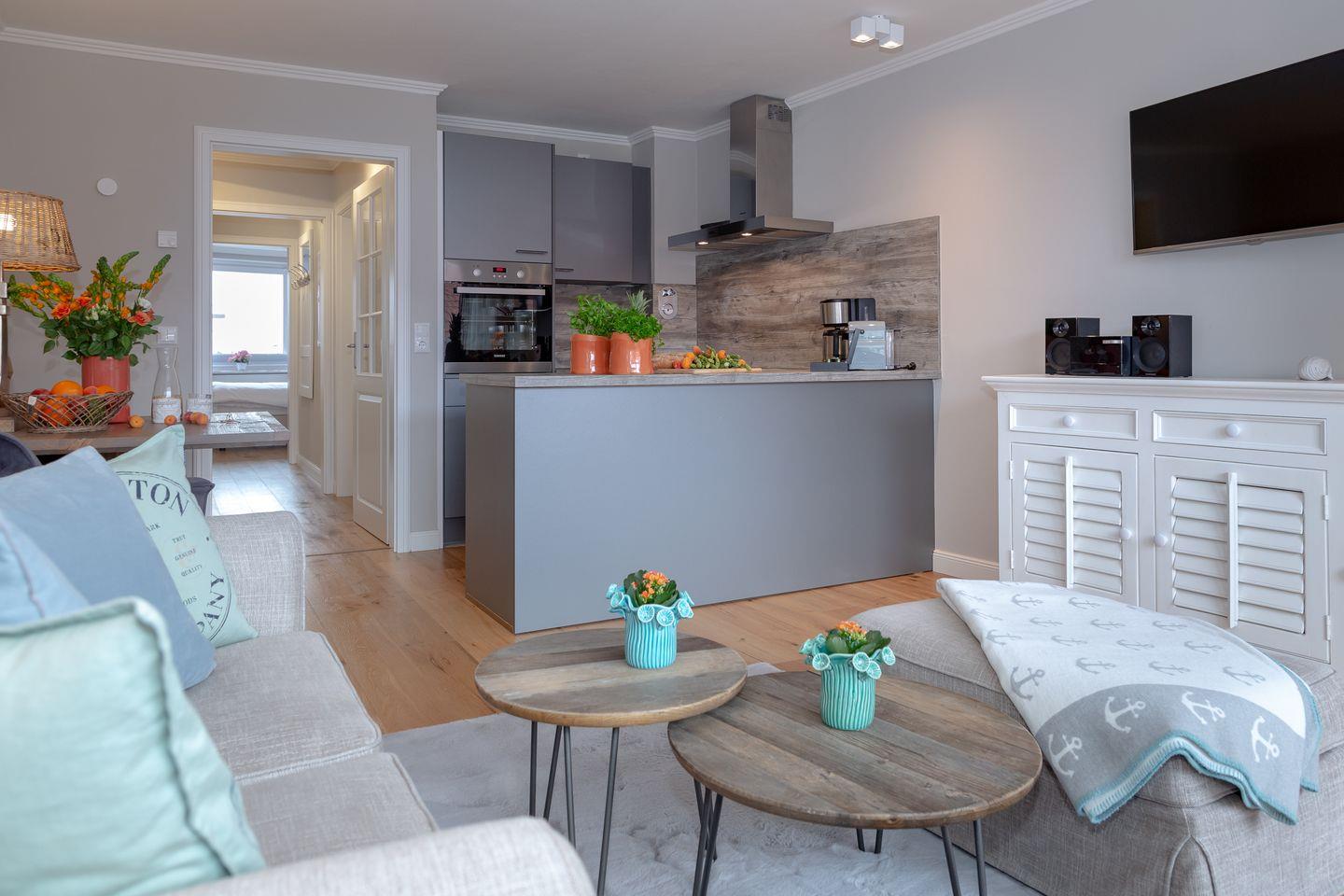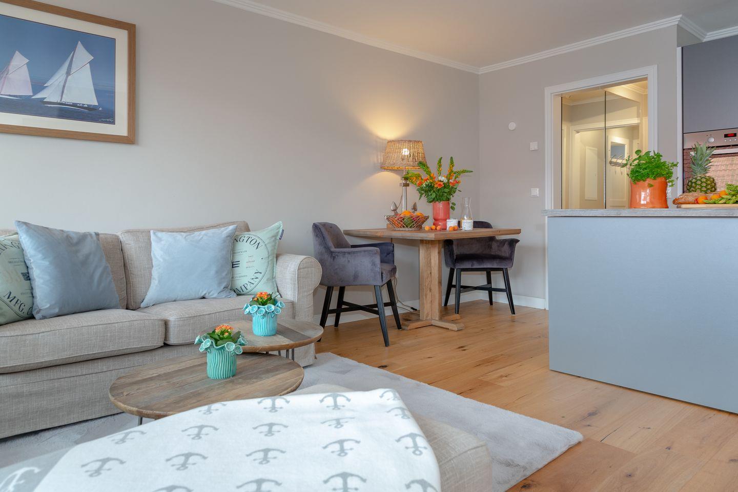 Genießen Sie hier eine unvergessliche Zeit inmitten des Herzens Westerlands und tauchen Sie ein in das schillernde Leben unserer Insel-Metropole. Ihr Appartement ist mit viel Liebe und exklusivem Geschmack eingerichtet, welcher durch das edle Eichenparkett noch unterstrichen wird. Der behagliche Wohn / und Essbereich bietet Ihnen eine bequeme Sofalandschaft zum Entspannen und den direkten Zugang zu Ihrem, nach Süden ausgerichteten Balkon mit Blick auf die bekannte Friedrichstraße und auf die wundervolle Nordsee! Hier können Sie, geschützt vor dem Sylt-typischen Nordwind, Ihre persönlichen Sonnenstunden verbringen. An den Essbereich grenzt die hochwertig und vollständig ausgestattete Küche, in der Sie die Selbstverpflegung im Urlaub zum Vergnügen werden lassen können. In Ihrem Schlafzimmer nächtigen Sie in einem komfortablen Boxspringbett, das Ihnen einen geruhsamen Schlaf garantiert. Selbstverständlich finden Sie hier auch genügend Stauraum für Ihre Garderobe vor. Die dezente Farbgestaltung und das edle Design im Badezimmer mit bodentiefer Dusche garantiert Ihnen eine Wohlfühl-Zone, in der Sie den Alltagsstress hinter sich lassen können. Die Ferienwohnung befindet sich in der vierten Etage, welche über einen Fahrstuhl bequem zu erreichen ist und somit für Sie keine Unannehmlichkeiten entstehen. Waschmaschine und Trockner befinden sich im Gemeinschaftsraum.