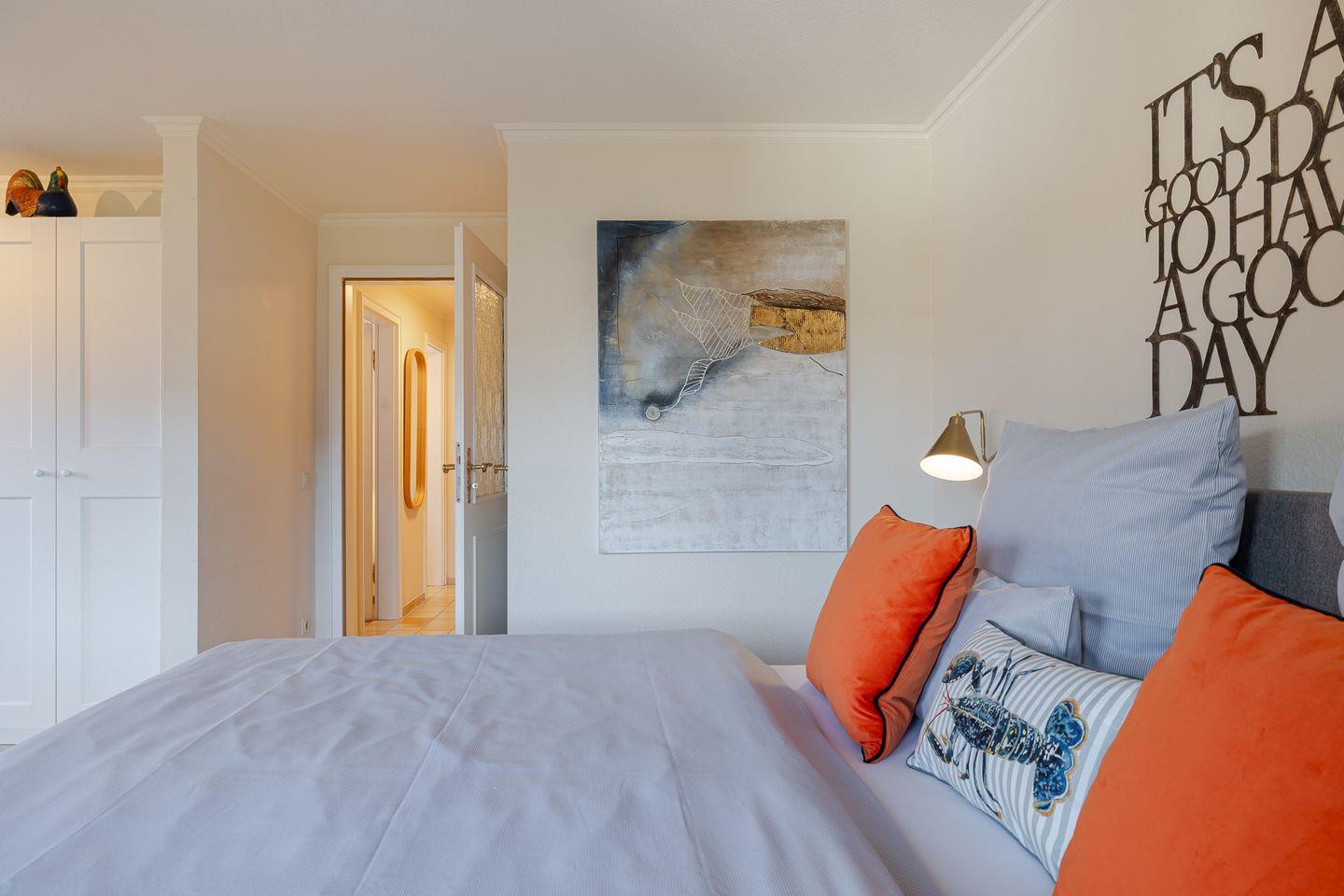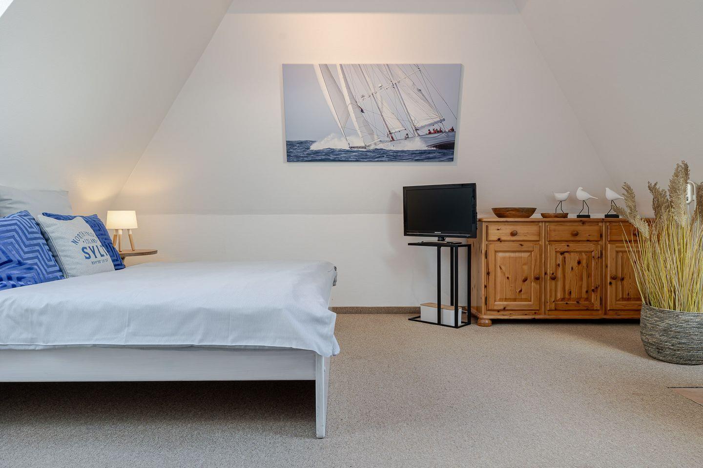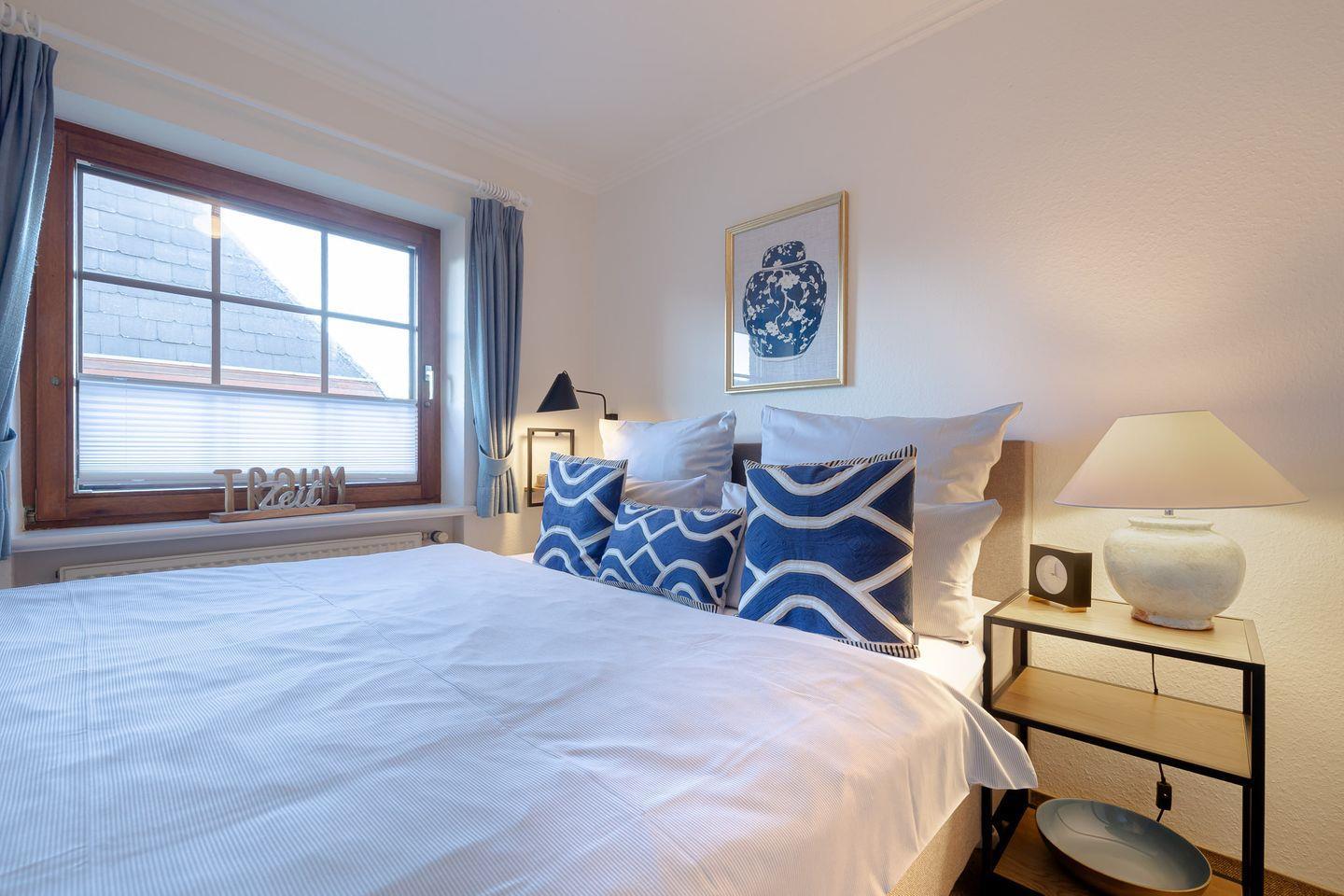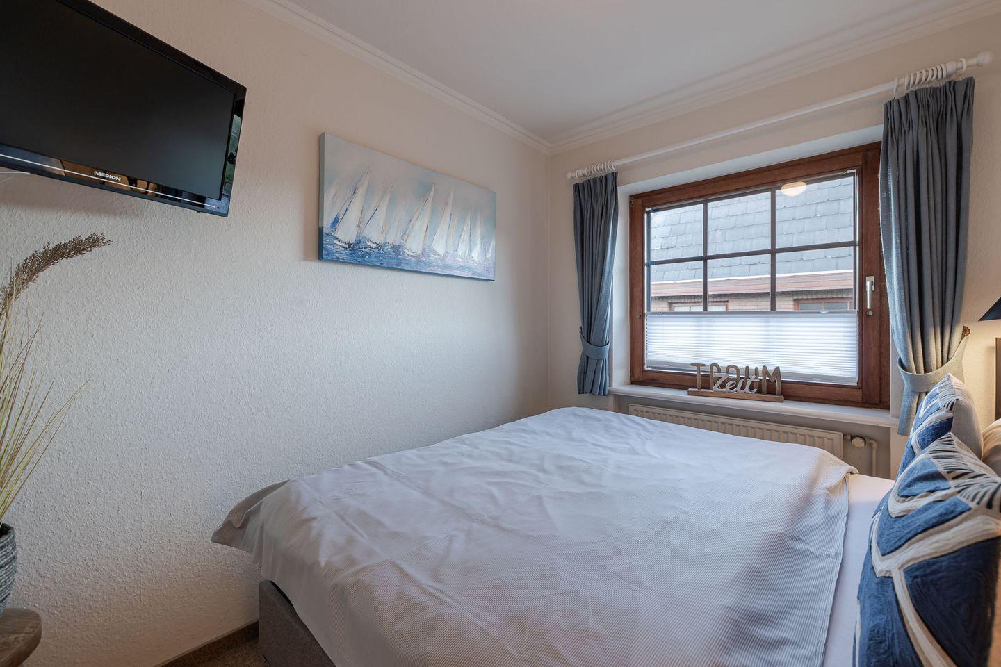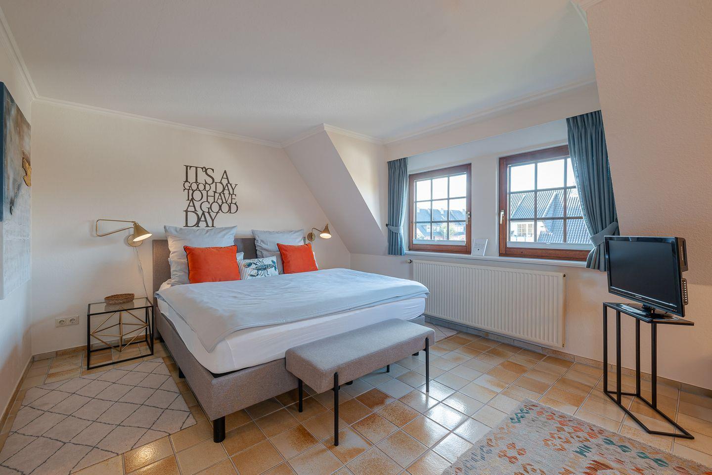 Auf der oberen Etage liegen die Schlafräume, die mit viel Liebe zum Detail gestaltet wurden. Das großzügige Hauptschlafzimmer überzeugt mit seiner freundlichen Ausstrahlung, viel Platz und einem komfortablen Boxspringbett in 180x200 cm, das für erholsame Nächte sorgt. Gleich daneben befindet sich ein kleineres, besonders gemütliches Schlafzimmer mit einem 160x200 cm Bett, maritimen Akzenten und warmen Stoffen – perfekt für Paare, Freunde oder ältere Kinder.
