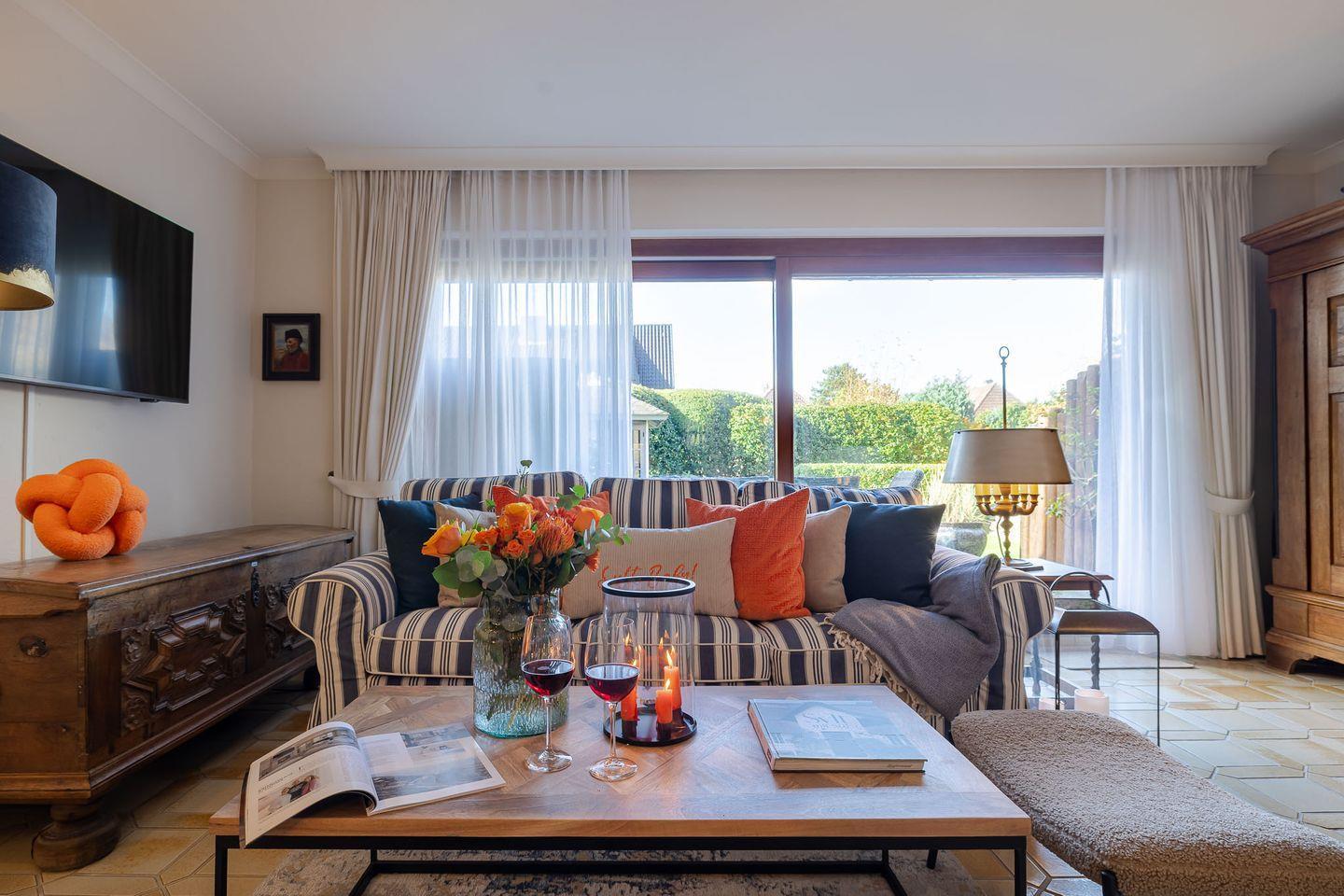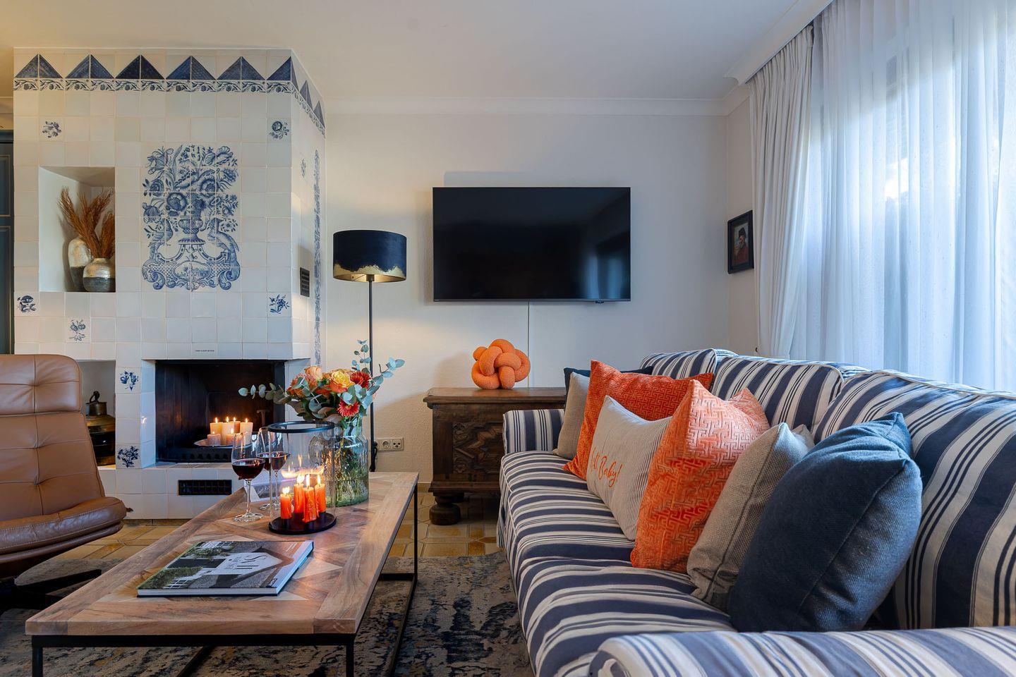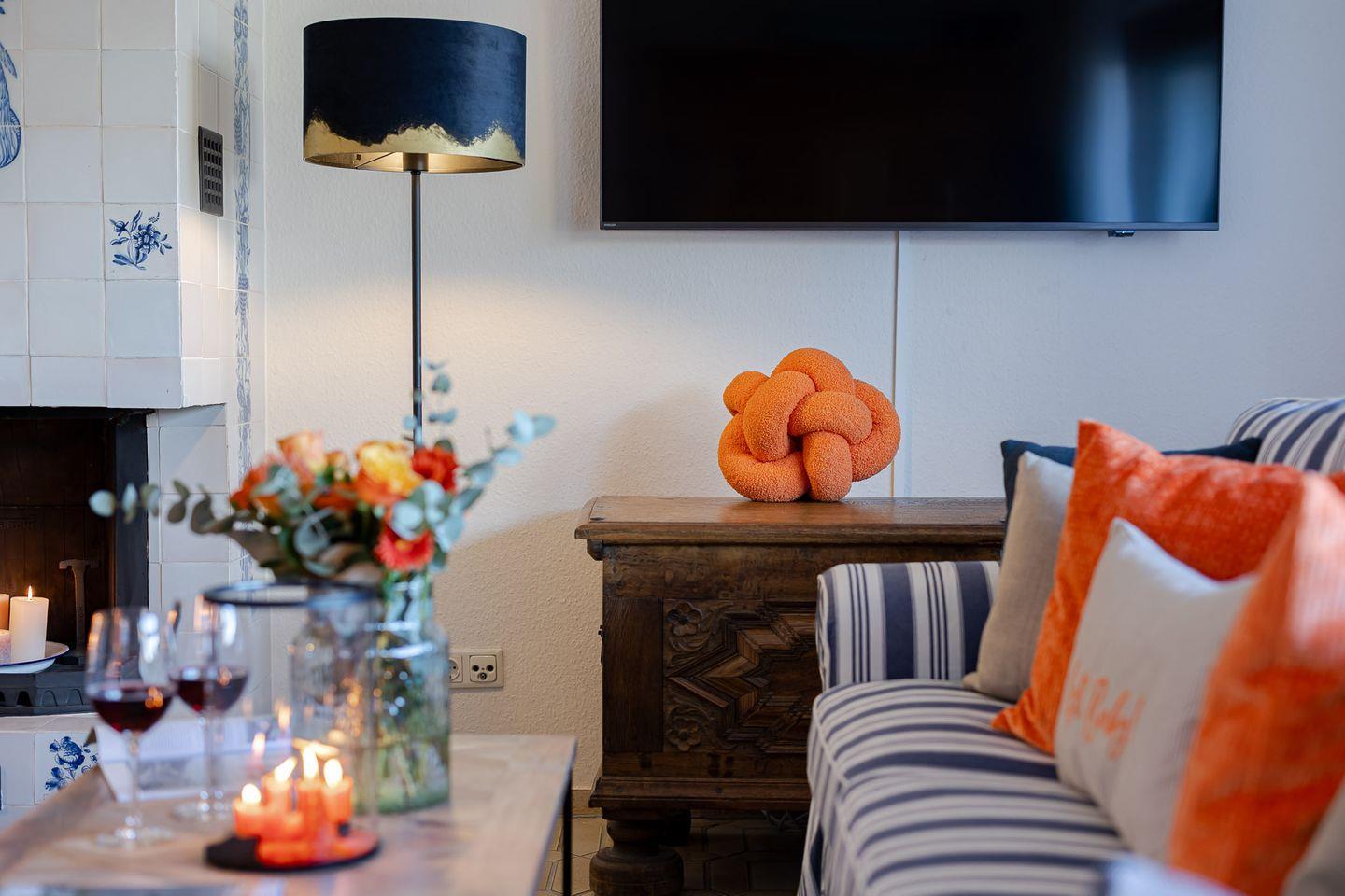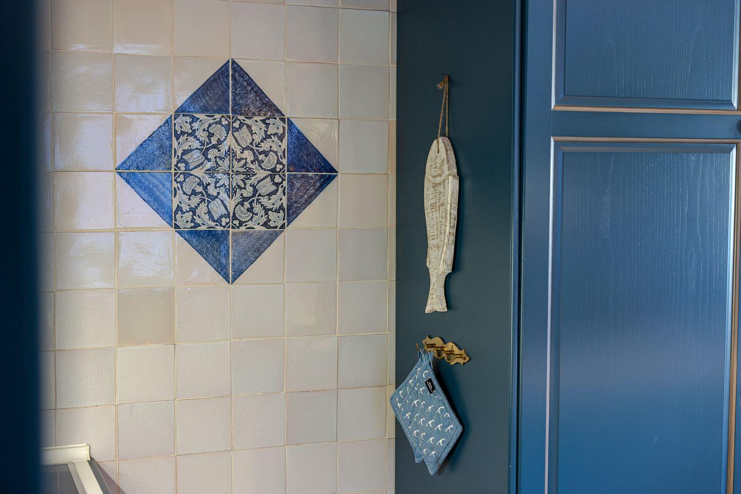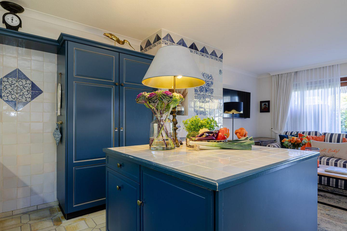Die wunderschöne Landhausküche in Ozeanblau, die gemütliche Sofaecke und die warmen Farben schaffen innen ein Gefühl von Geborgenheit. Der Kamin ist dekorativ, zaubert aber mit seinen Kerzenlichtern eine stimmungsvolle Atmosphäre – besonders an kühleren Tagen. Auf dieser Ebene befinden sich zudem ein Vollbad sowie ein praktischer Waschraum, ideal für längere Aufenthalte, Strandtage und Reisen mit Kindern oder Hund.