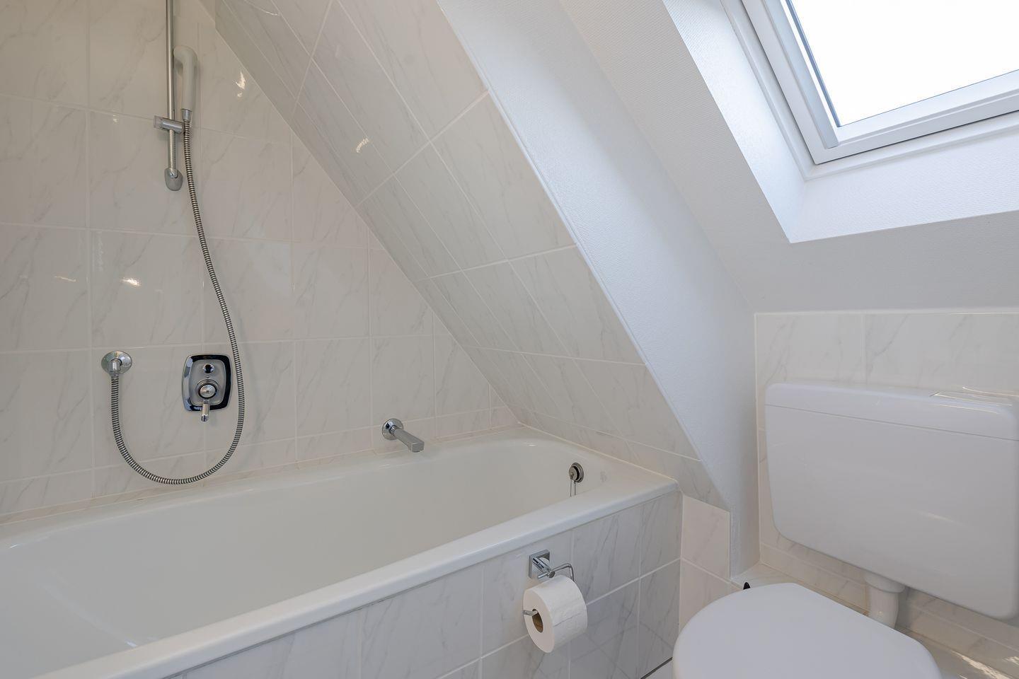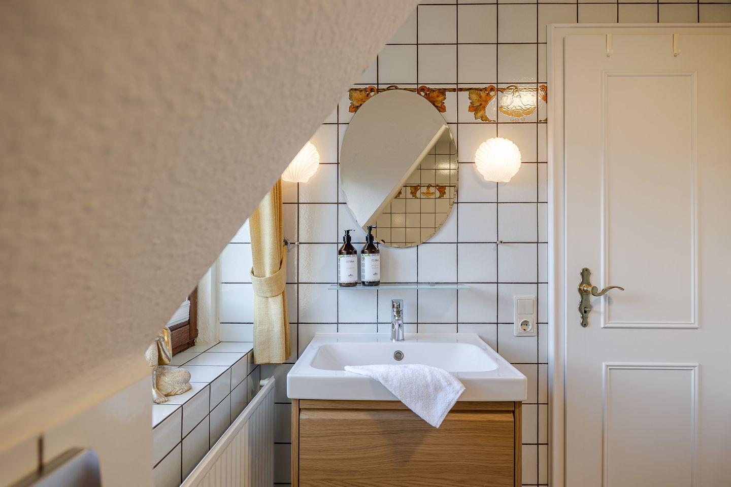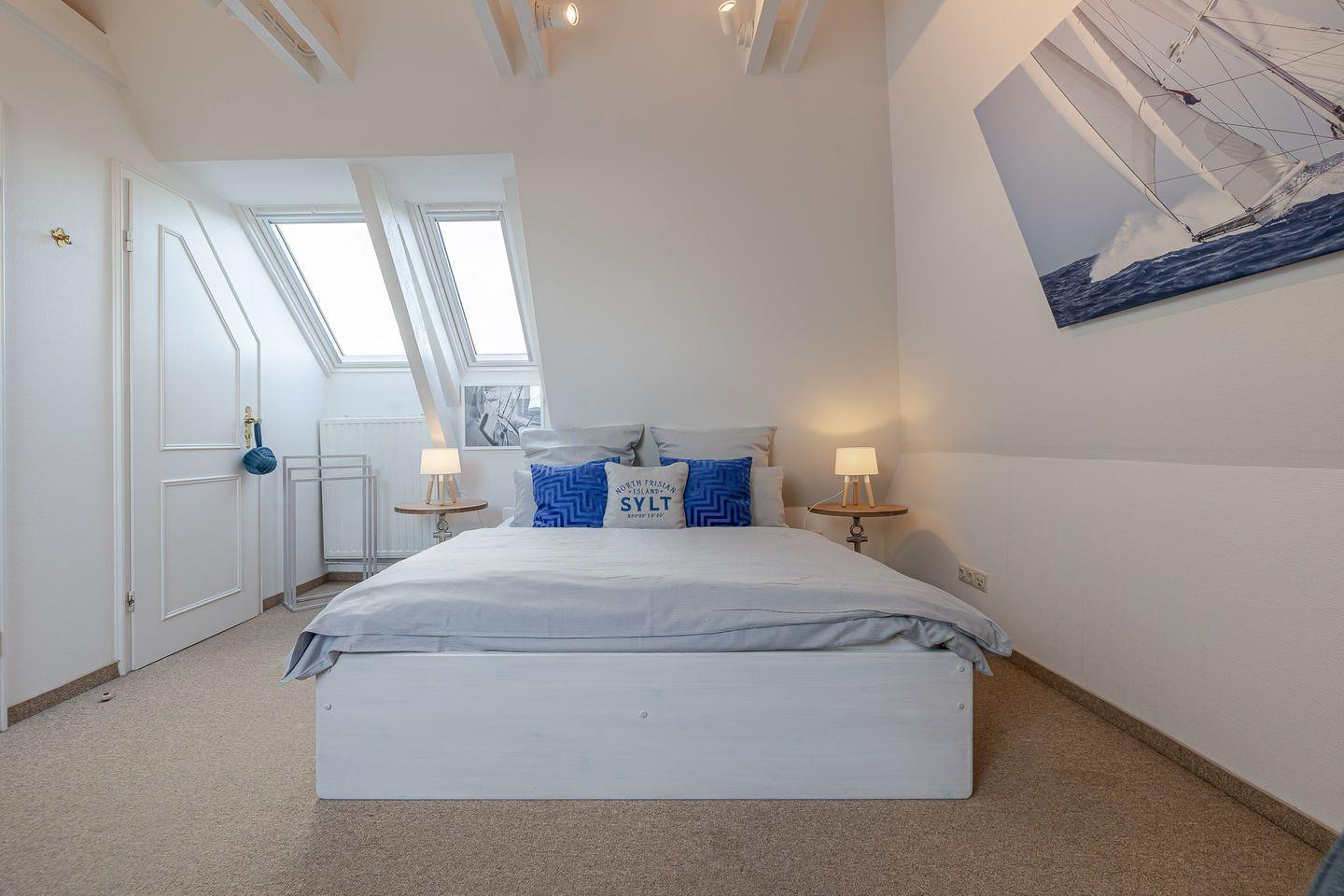 Unter dem Dach eröffnet sich ein weiterer, lichtdurchfluteter Rückzugsort: ein Schlafzimmer mit charmanten Schrägen, ebenfalls mit einem 160x200 cm Bett, viel Stauraum und einem kleinen Arbeitsplatz direkt am Dachfenster, der den Blick in den Himmel freigibt. Ein eigenes Badezimmer mit Badewanne verleiht diesem Bereich eine wohltuend private Note.