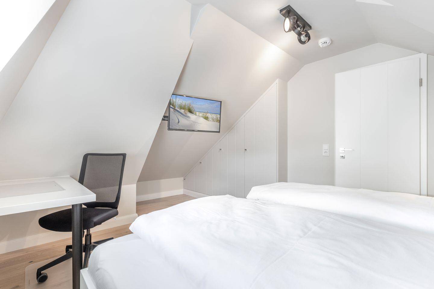 Helle Töne, feine Stoffe und stimmungsvolle Beleuchtung verleihen dem Raum wohltuende Ruhe. Ein Smart-TV und passgenaue Einbauten sorgen für zusätzlichen Komfort, während das große Dachfenster viel Licht und eine freundliche Atmosphäre spendet.