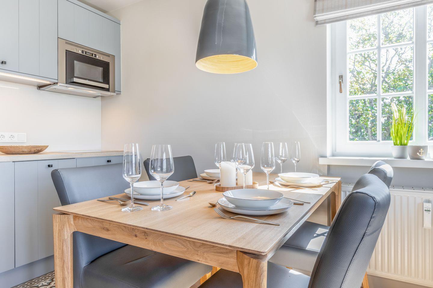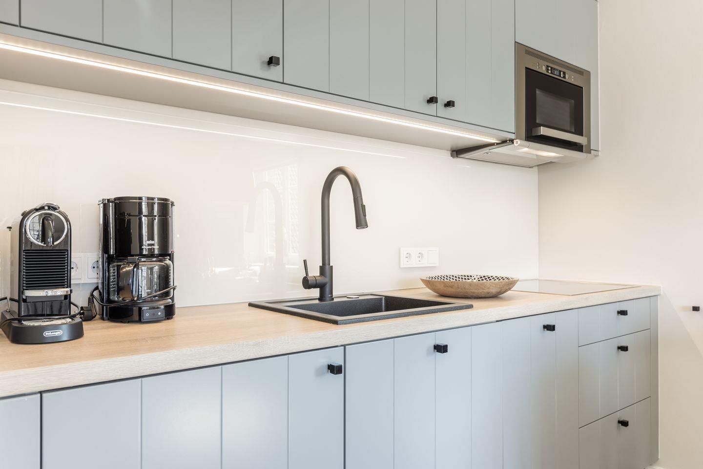Die moderne Einbauküche fügt sich harmonisch in das Gesamtbild ein und ist mit hochwertigen Geräten ausgestattet – darunter Induktionskochfeld, Backofen, Mikrowelle, Geschirrspüler, Wasserkocher, Toaster und Nespresso-Maschine.