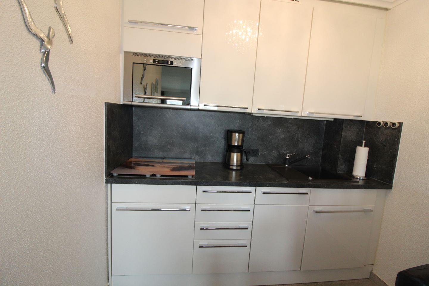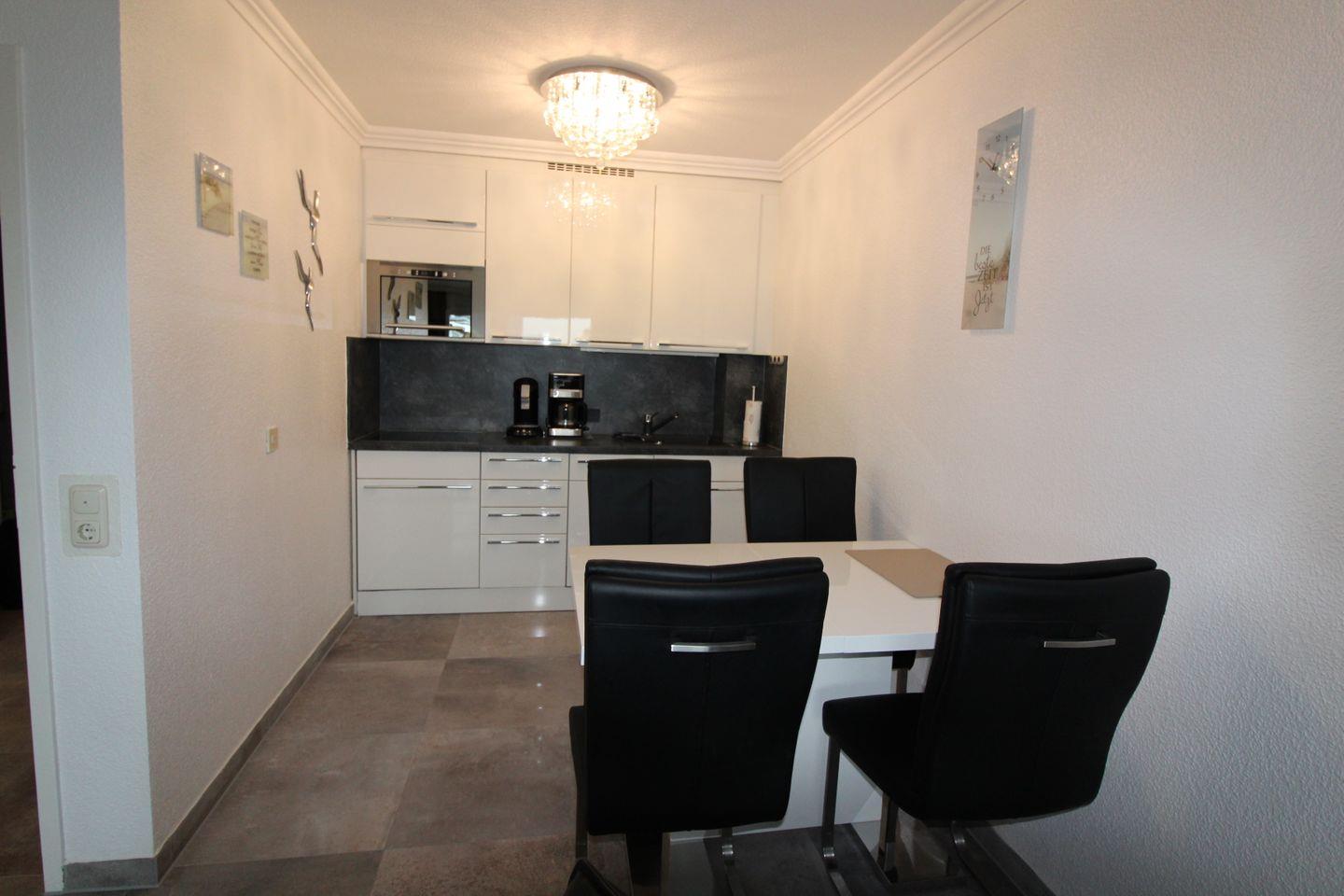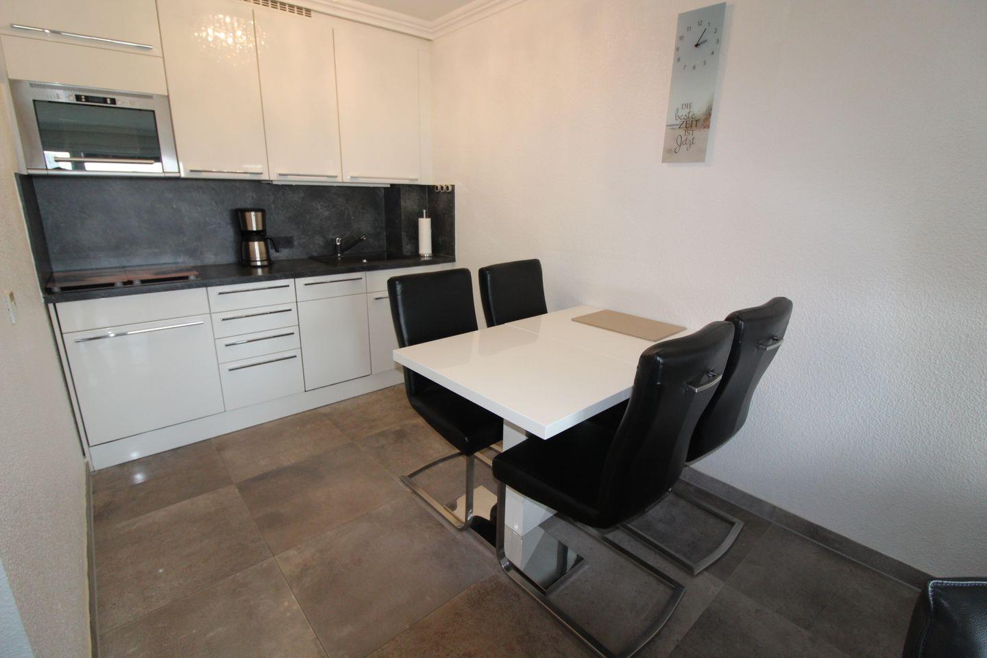 • Küchenzeile: Hochwertig ausgestattet mit Ceranfeld, Mikrowellen-/Grillkombination, integrierter Abzugshaube und Geschirrspüler, Kühlschrank mit Gefrierfach