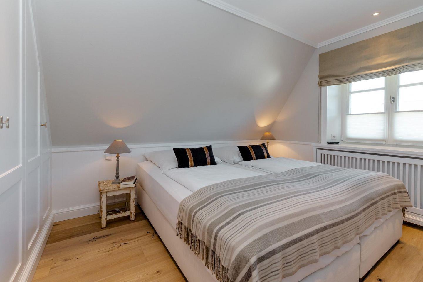Diese traumhafte Doppelhaushälfte unter Reet bietet alles, was einen besonderen Sylt-Urlaub ausmacht. Die hellen Farben und die erlesene Materialauswahl und bezaubernde Antiquitäten im Schweden-Stil verleihen den Räumen ein warmes und behagliches Ambiente. Zahlreiche Tischlereinbauten begeistern in allen Räumen. Vor dem historischen Kachelofen können Sie es sich mit einem spannenden Buch oder einem romantischen Gläschen Wein gemütlich machen. Die gekonnt vom Tischler verbaute moderne BOSE 5.1-Soundanlage verwandelt den Wohnraum bei Bedarf in einen Konzertsaal. Im Obergeschoss erwarten Sie zwei Schlafzimmer und zwei hochwertige Bäder mit Bewegungsmeldern für Schummerlicht, Einbauradios, beheizten Handtuchhaltern und Regenduschen. Die großzügige Sauna schafft eine Wellness-Atmosphäre. Die große Südwest-Terrasse ist bestens geeignet für erholsame Sonnenstunden an der Sylter Luft.