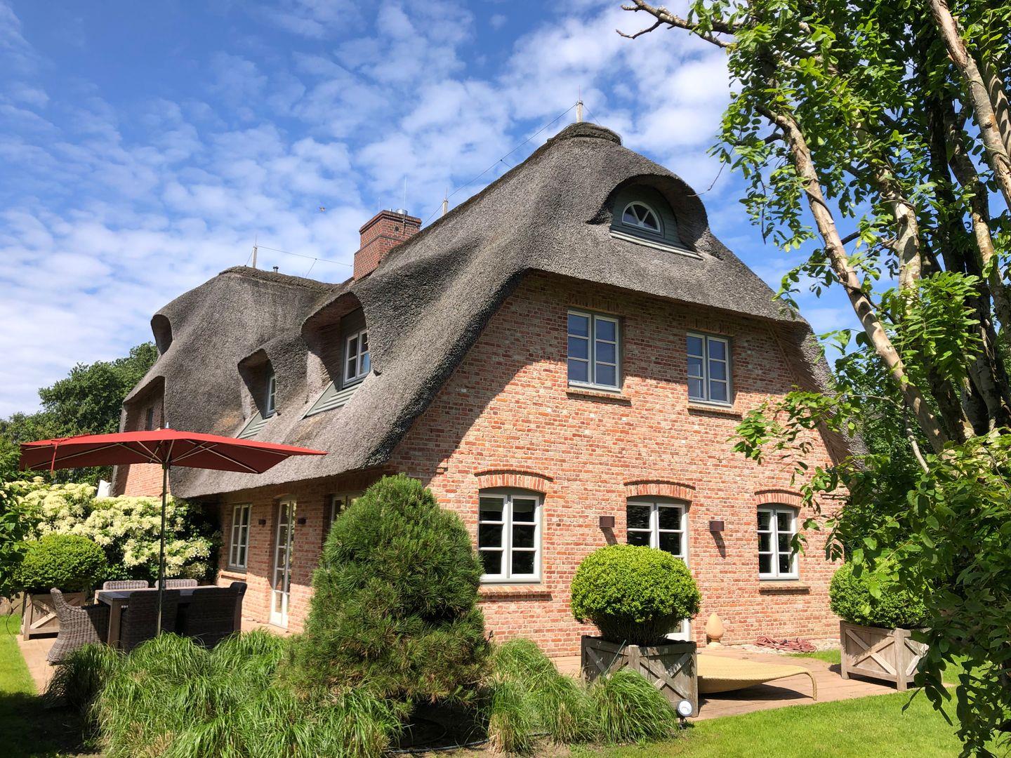 Stilvolle Haushälfte unter Reet in Archsum mit elegantem Interieur, Sauna und großem Garten für exklusive Sylt-Urlauber.