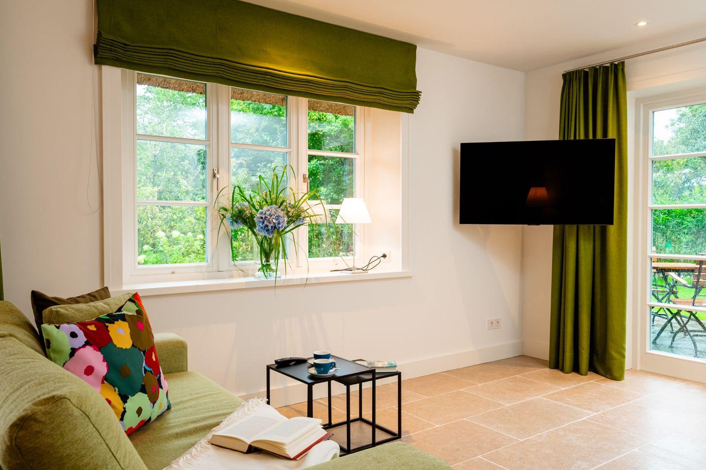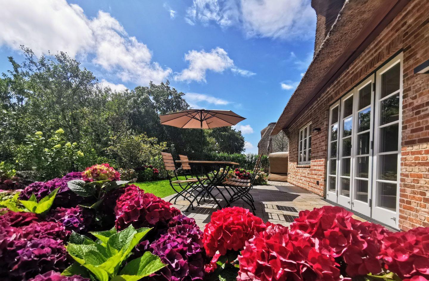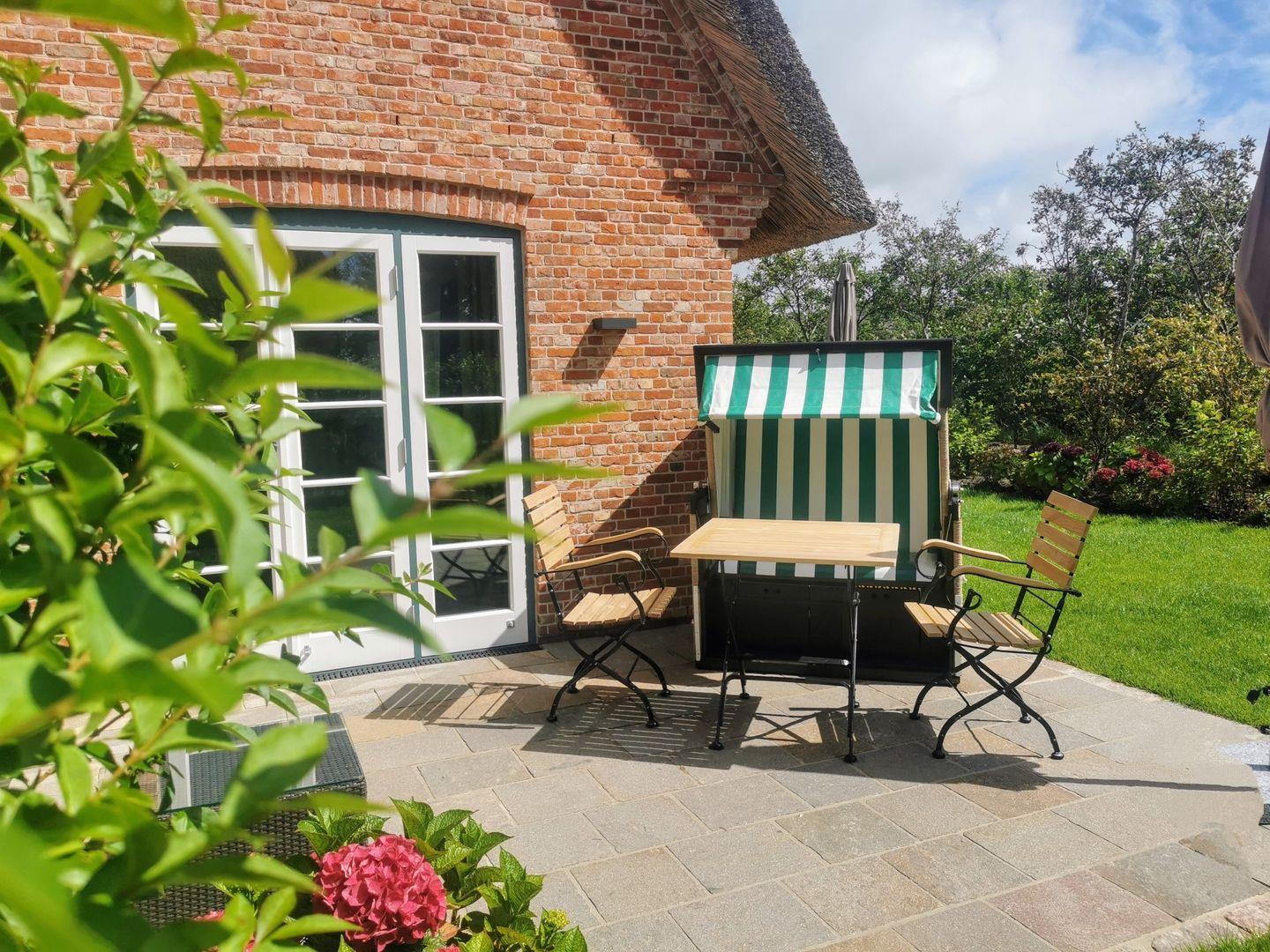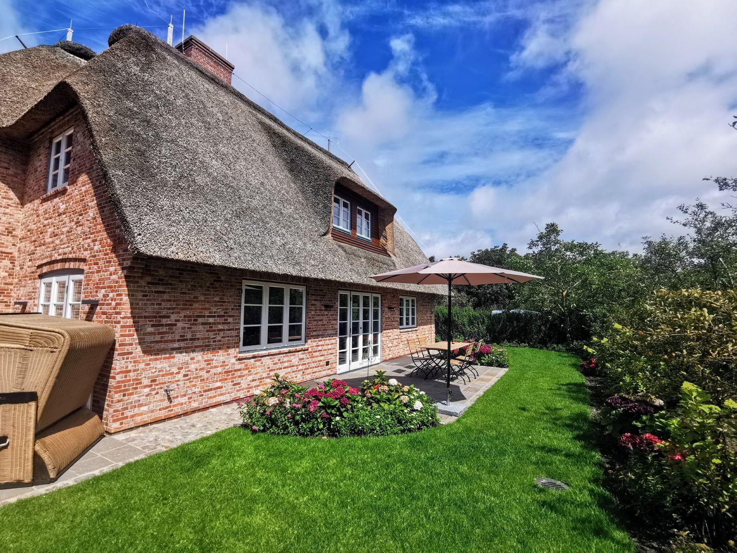 Exklusive Doppelhaushälfte unter Reet in idyllischem Keitum, modern ausgestattet mit Sauna, Garten und Nähe zum Wattenmeer.