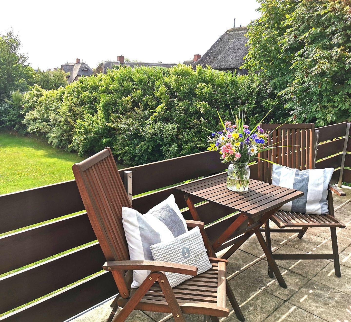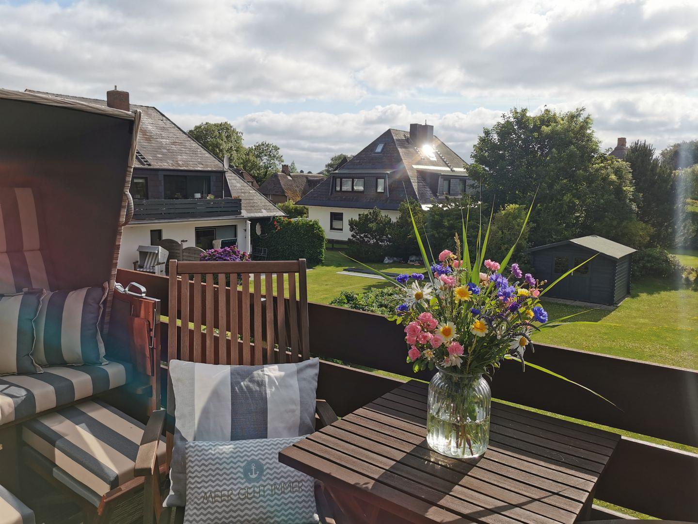 Gemütliche Ferienwohnung im Herzen von Morsum mit traumhaftem Gartenblick und Balkon mit Strandkorb.