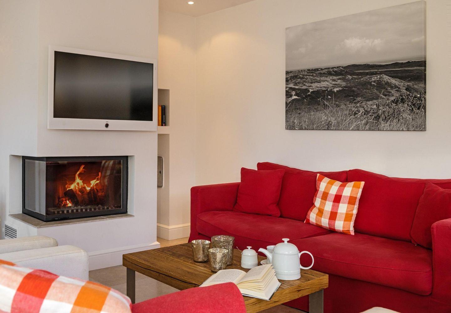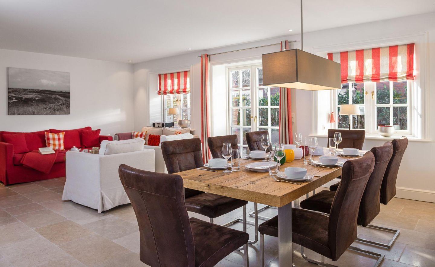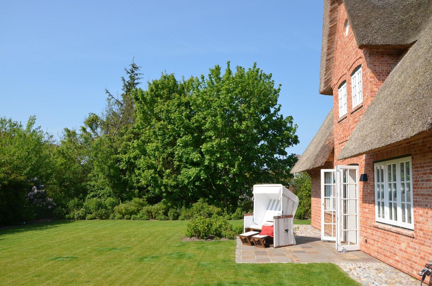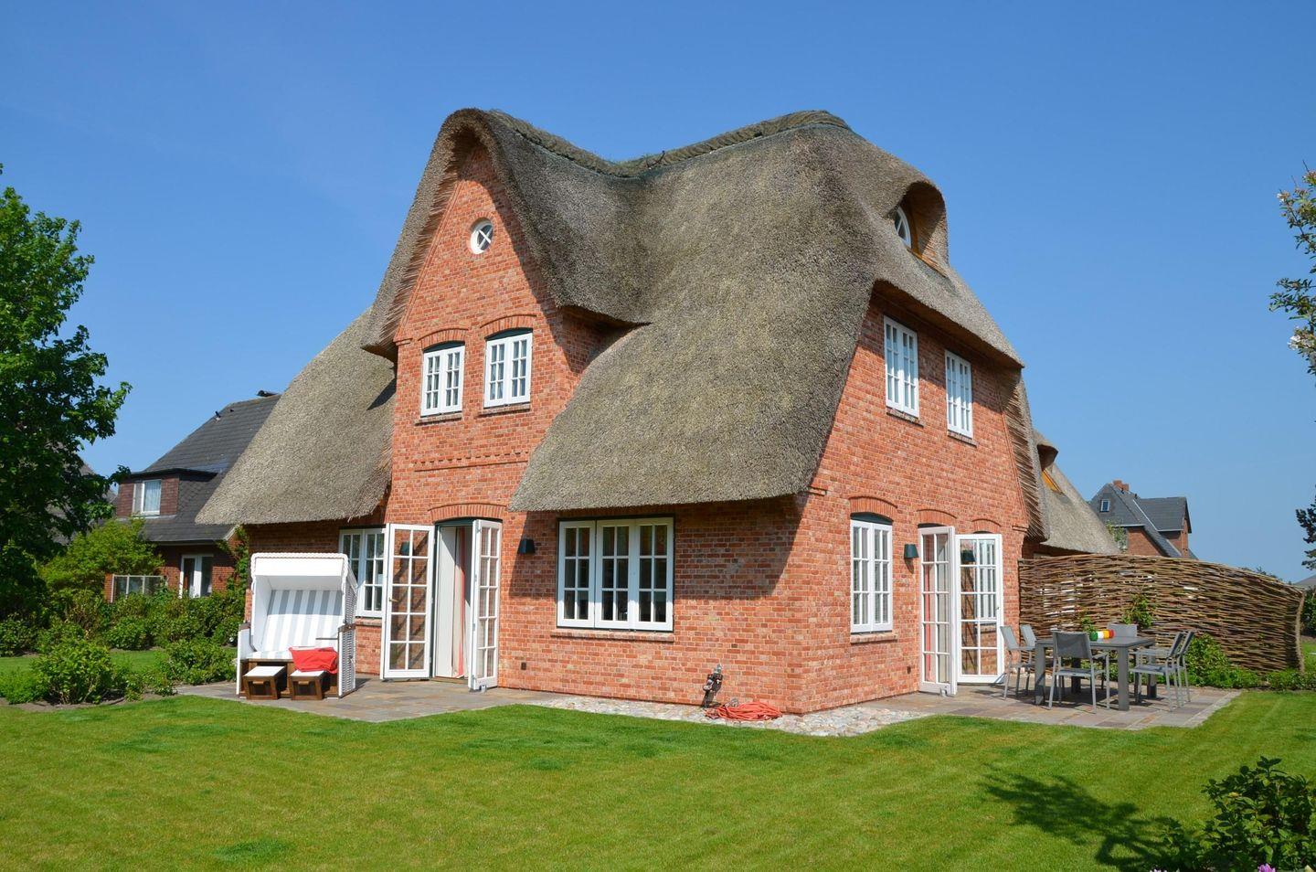 Luxuriöse Doppelhaushälfte unter Reet in Morsum mit großzügigem Garten, Sauna und Kamin für entspannte Urlaubstage auf Sylt.