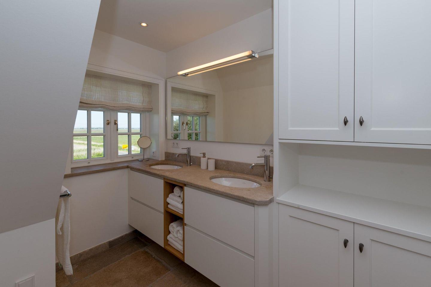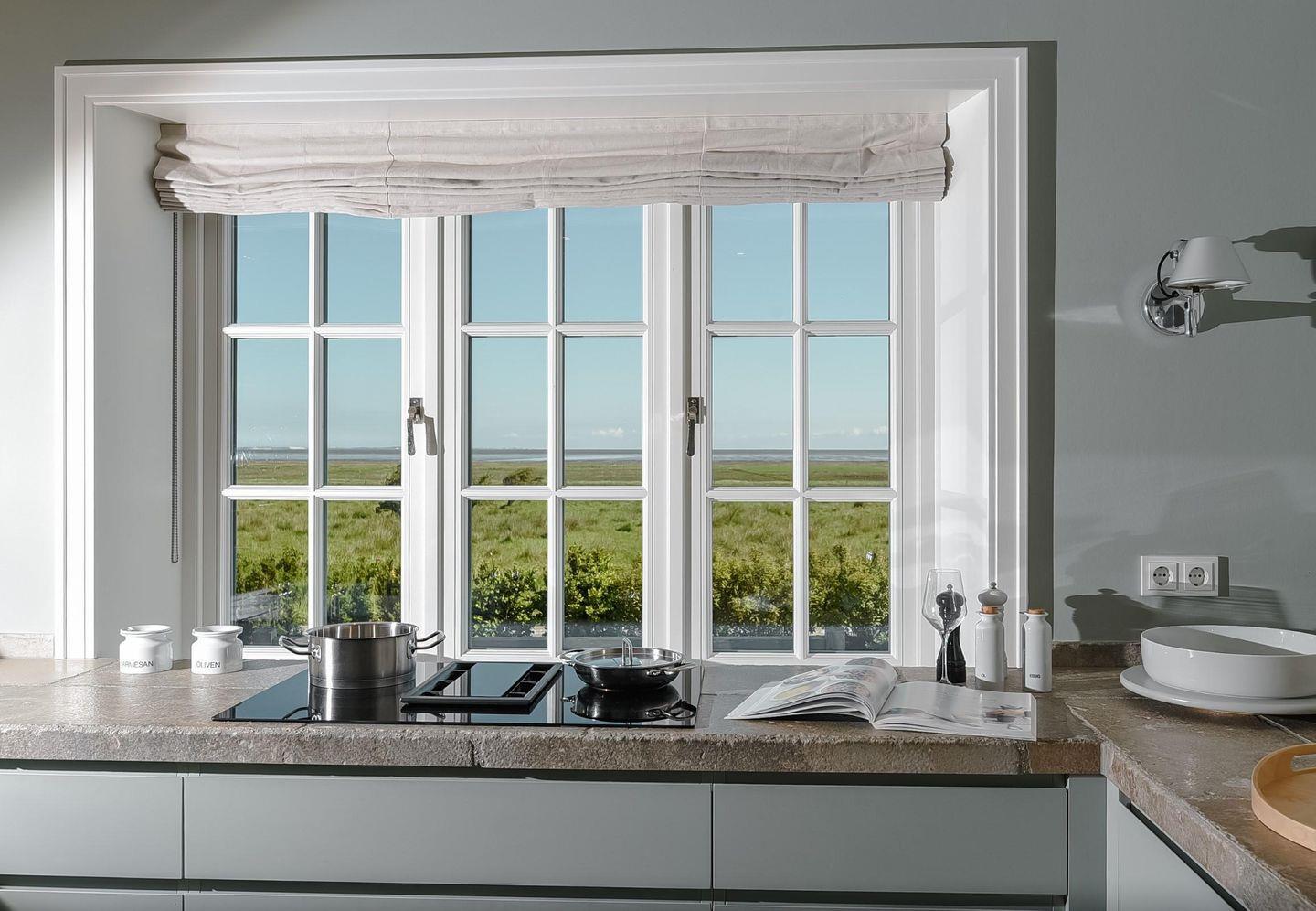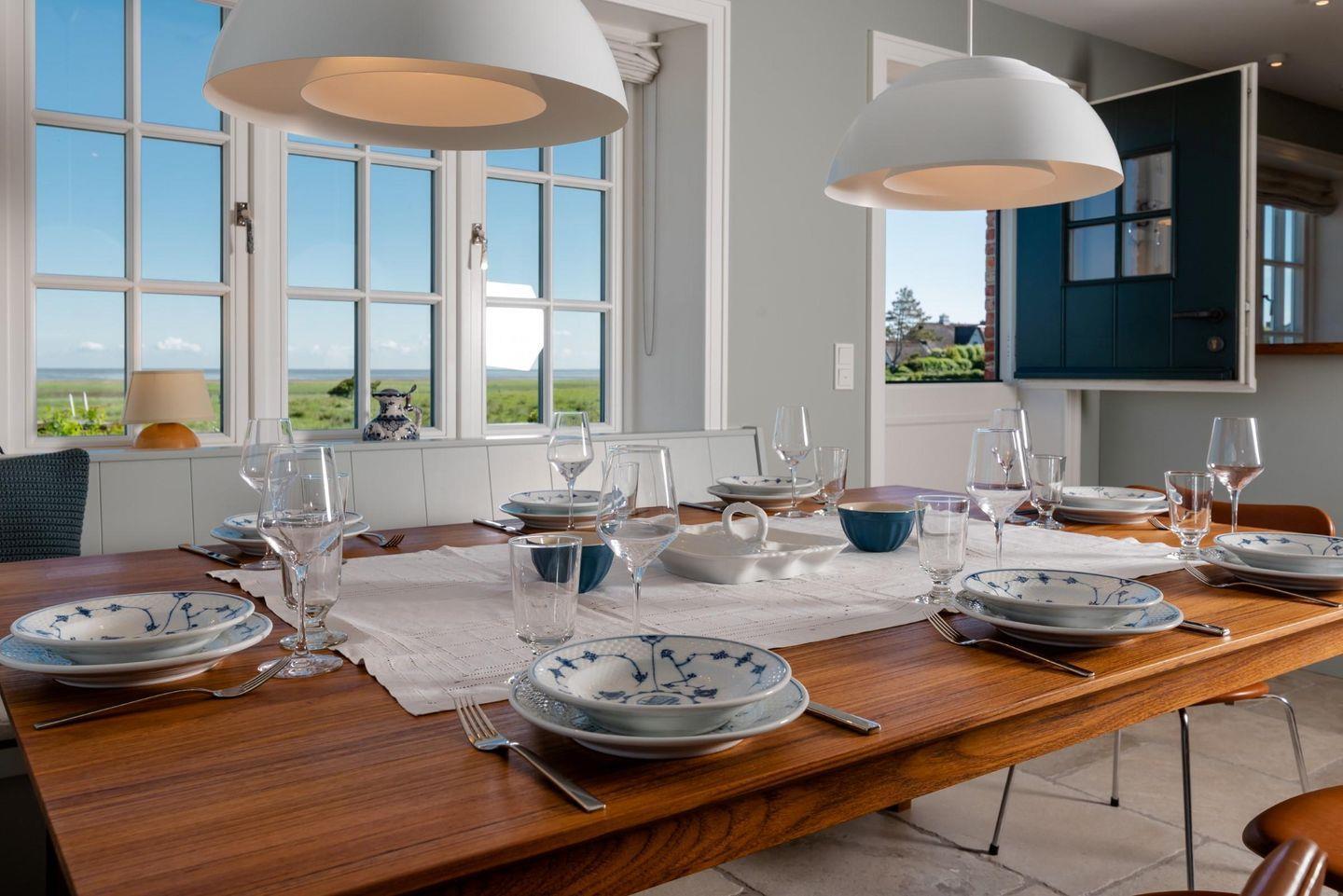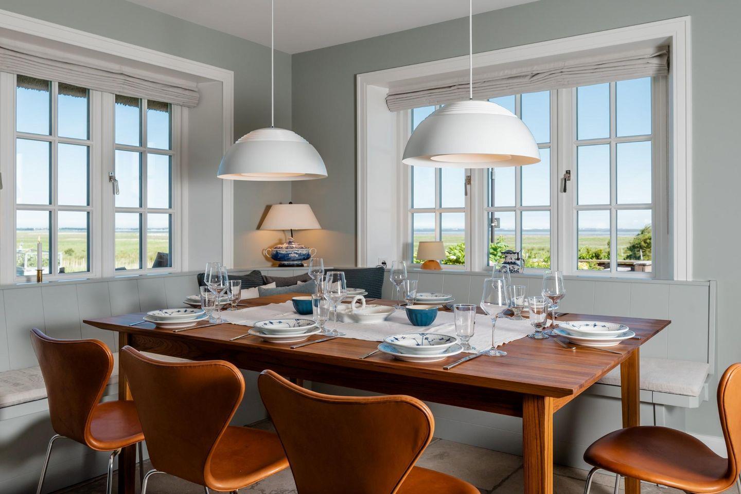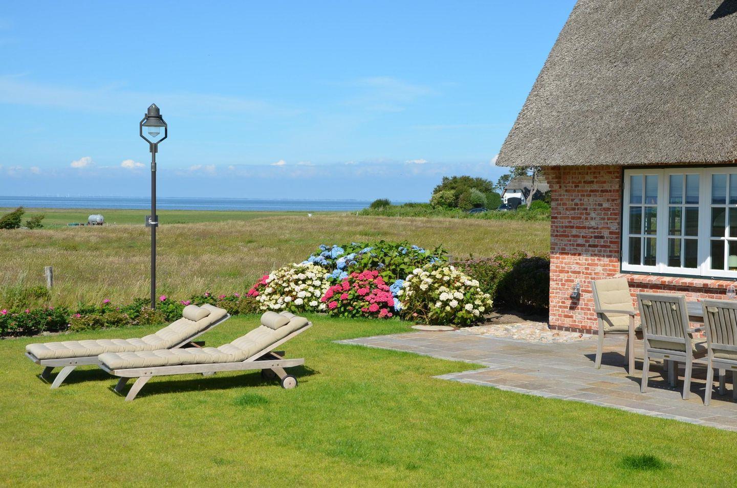 Die 2019 fertiggestellte Doppelhaushälfte "Liiglön" liegt an den Wattwiesen vor Morsum auf Sylt. Frei ist der Blick nach Norden und Westen über das Vogelschutzgebiet hinaus auf das Wattenmeer. Hoch und trocken liegt das schöne Friesenhaus in Hortensienbüschen und Rosen. Drinnen schaffen eine handwerklich erstklassige Einrichtung und Holz, Leinen und lichten Farben ein gemütliches Ambiente. An rauen Tagen sorgen die Sauna und der offene Kamin für Entspannung. Von der großzügigen Terrasse aus sieht man die Sonne untergehen, und sogar beim Kochen hat man Vogelschwärme und Wattenmeer voll im Blick.