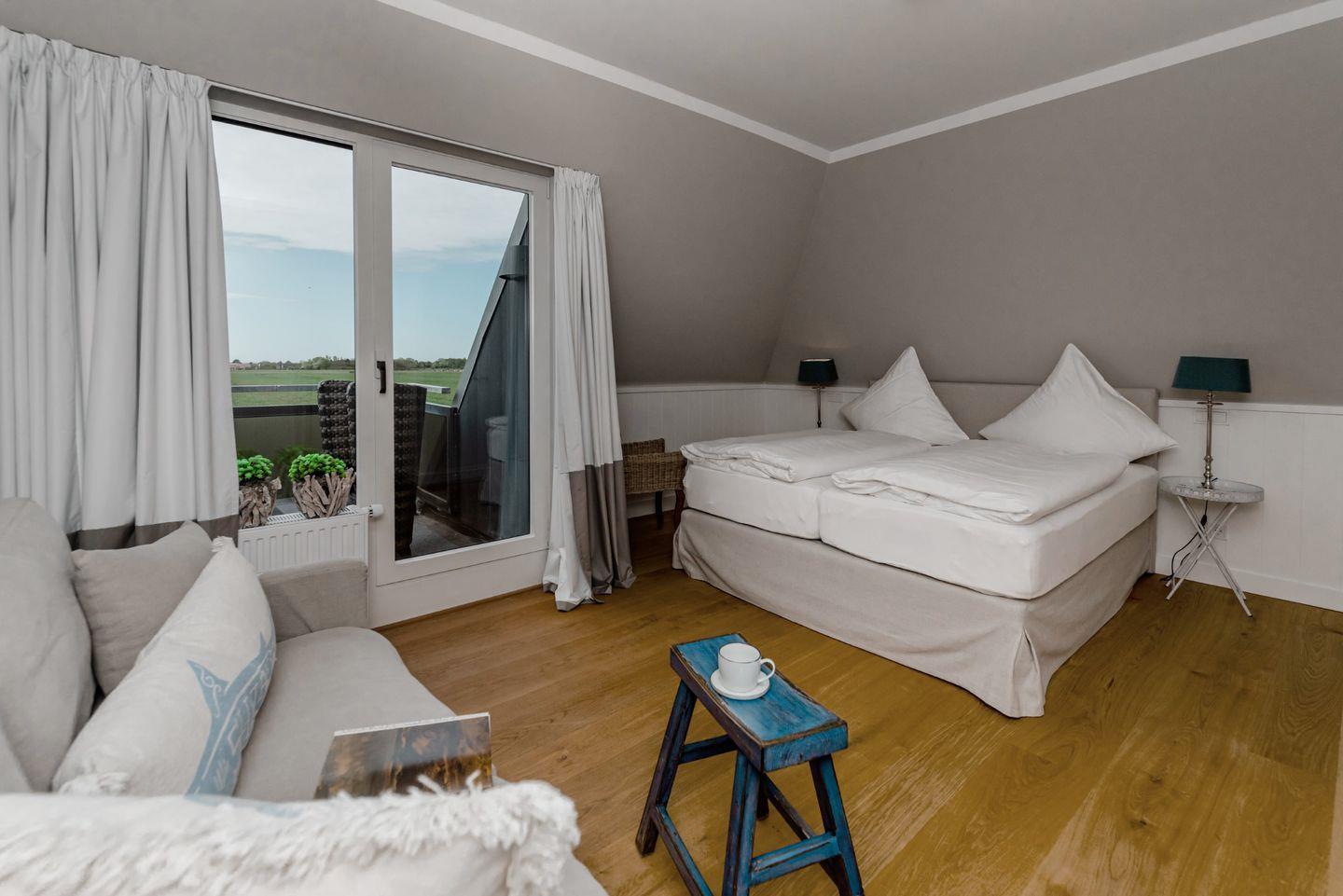 Exklusiv eingerichtetes Endhausteil mit traumhaften Weitblick! Ausgestattet mit hochwertigen Materialien, zahlreichen Tischlereinbauten und einem modernen Farbkonzept bietet es Platz für max. drei Erwachsene und zwei Kinder. Verbringen Sie erholsame Stunden vor dem Kamin oder auf der Südterrasse und blicken Sie dabei über weite Wiesen und den Deich bis auf das Weltnaturerbe Wattenmeer - auch vom Balkon im Hauptschlafzimmer!