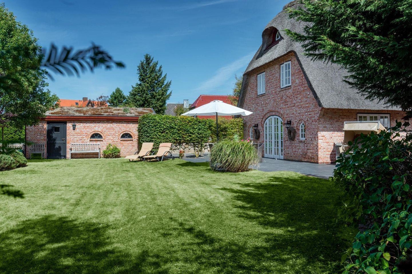 Exklusive Reetdach-Doppelhaushälfte in Morsum mit Garten, Terrasse und privatem Parkplatz nahe Wattenmeer.