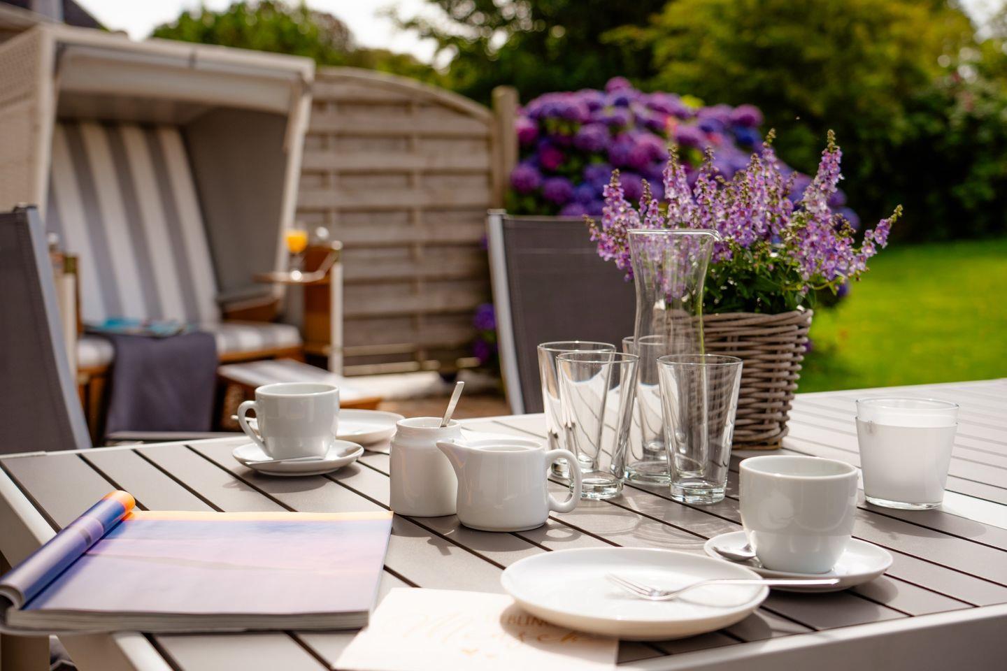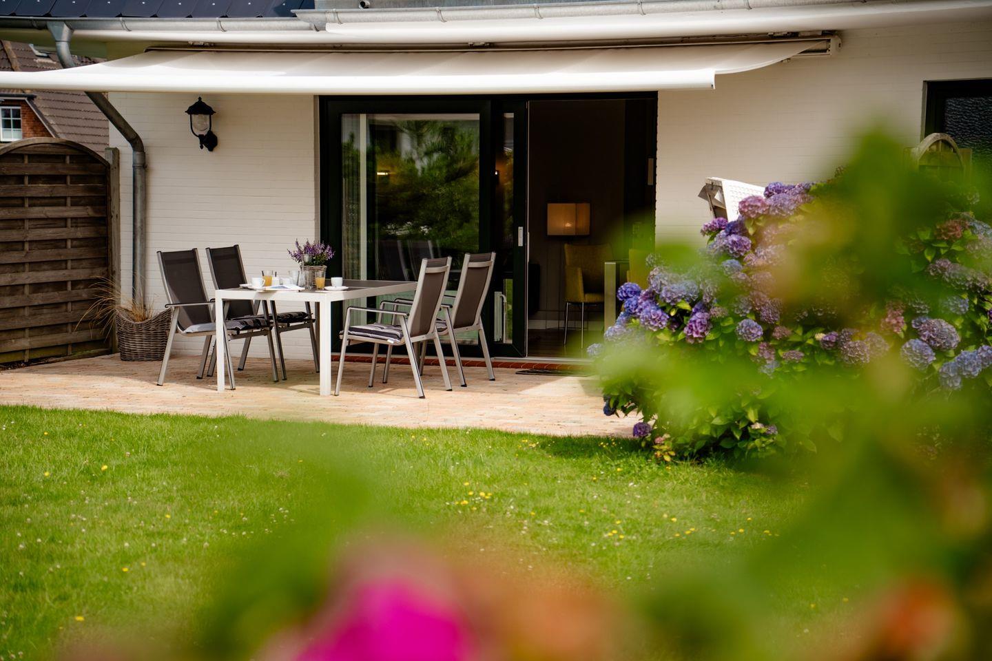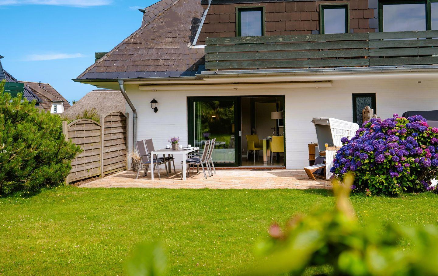 Moderne Ferienwohnung in Morsum mit Terrasse und Strandkorb, ideal für zwei Personen nahe Supermarkt und Bäcker.
