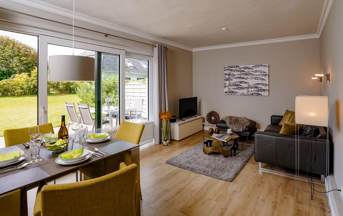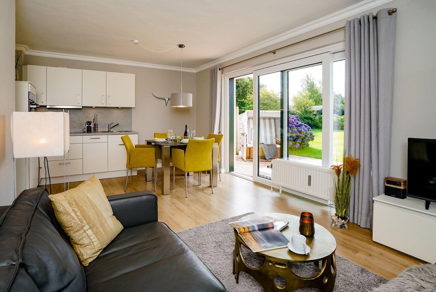 Diese lichtdurchflutete Ferienwohnung im Erdgeschoss begrüßt Sie mit einem großen Wohnbereich mit angrenzender Küche. Vom Wohnbereich haben Sie direkten Zugang zur eigenen Terrasse mit Strandkorb und Gemeinschaftsgarten. Die moderne Ferienwohnung kann mit maximal zwei Personen gebucht werden. Die Wohnung hat eni Doppelschlafzimmer und ein Einzelbettzimmer.