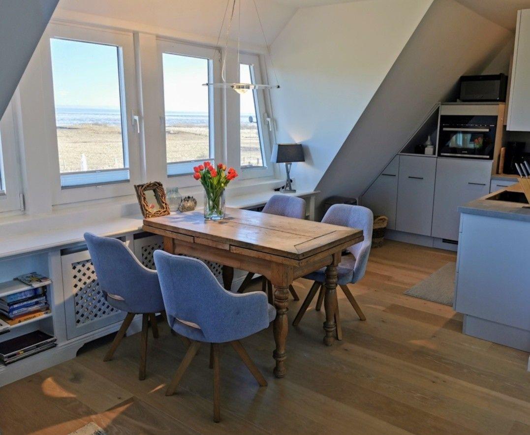 Urlaub ganz nah am Meer - dieses Gefühl erleben Sie in dieser gemütlichen OG-Wohnung unter Reet. Die helle und sonnige Wohnung überzeugt mit ihrem luftigem Wohnbereich, einer offenen Küche, einem modernen Badezimmer, sowie fantastischen Ausblicken. Ein ruhiger Terrassenplatz mit Strandkorb rundet das Angebot ab. Besonderes Highlight: Mit Ihrem ersten Morgenkaffee in der Hand, können Sie von der Wohnung aus den Sonnenaufgang über dem Wattenmeer und dem angrenzenden Naturschutzgebiet Nösse beobachten - ein perfekter Start in Ihren Urlaubstag! Maximal ein Hund auf Anfrage ist gestattet.
