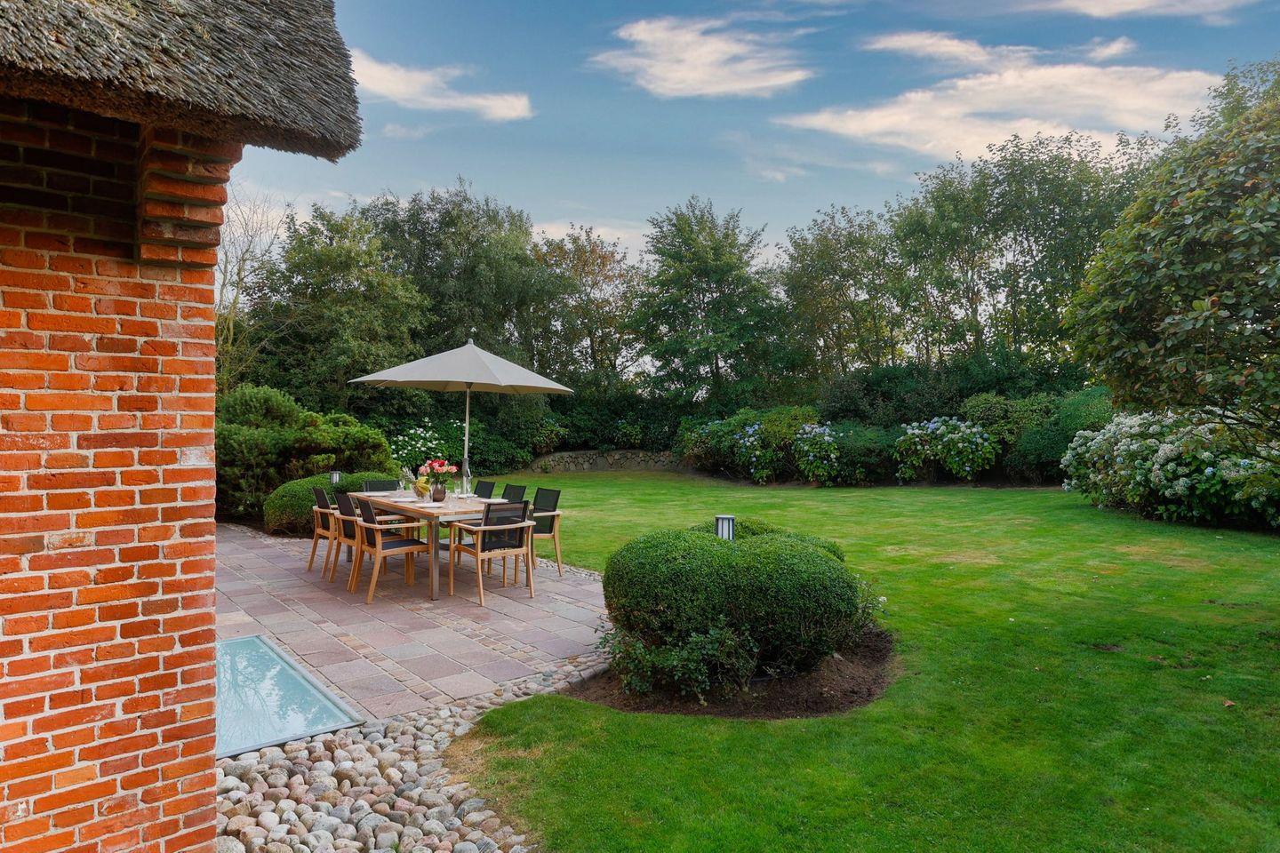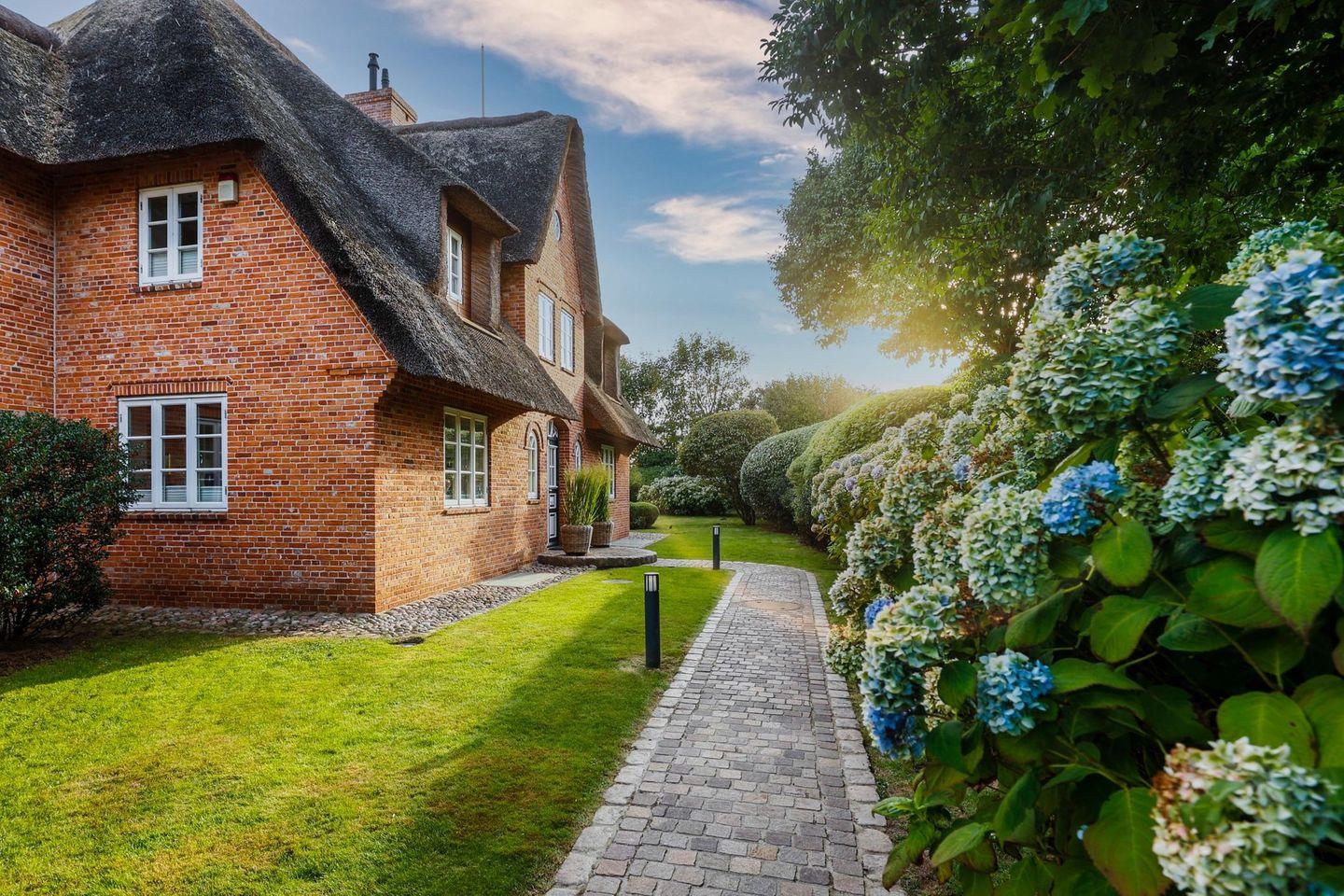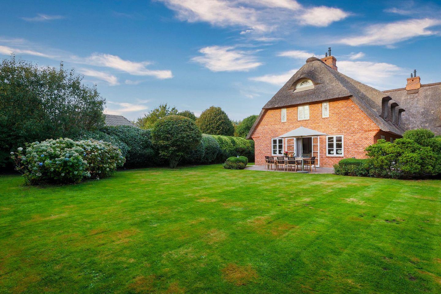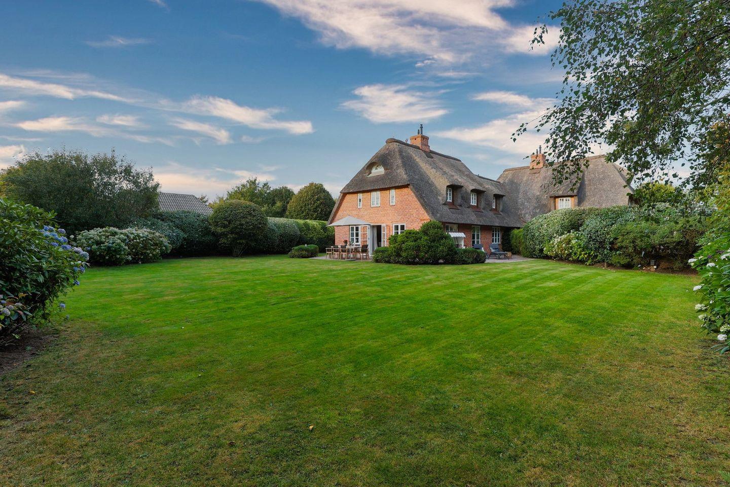 Exklusive, reetgedeckte Doppelhaushälfte in Keitum nahe Wattenmeer mit Sauna, Garten und moderner Ausstattung.