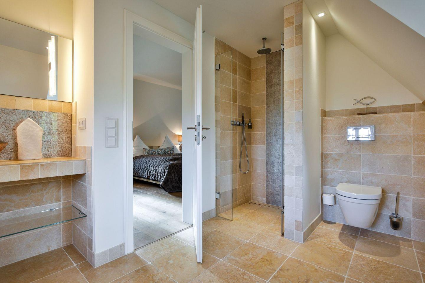 Bad 1: helles en Suite Bad mit Dusche, Badewanne und Handtuchwärmer