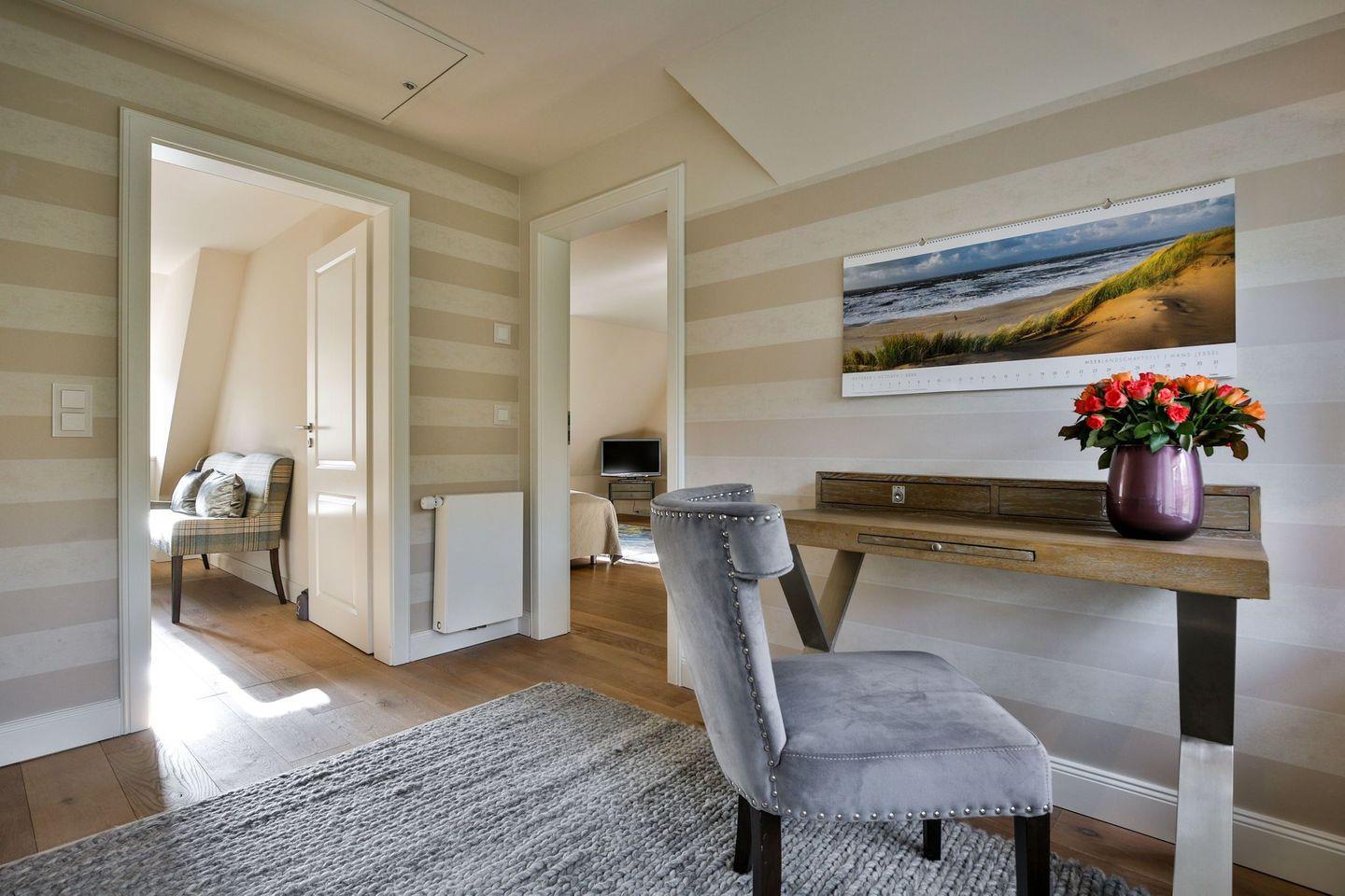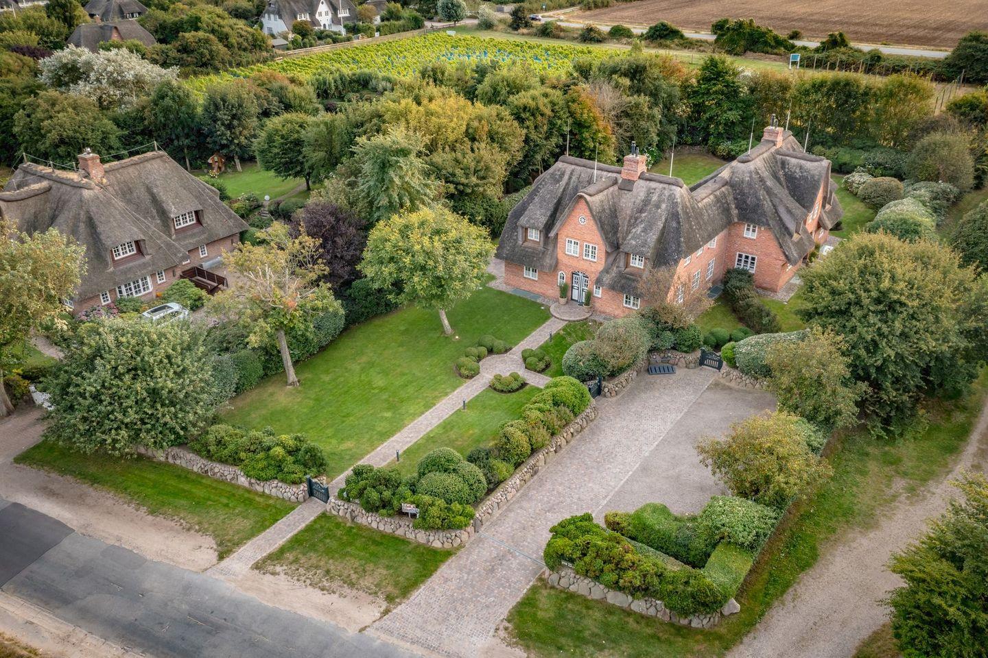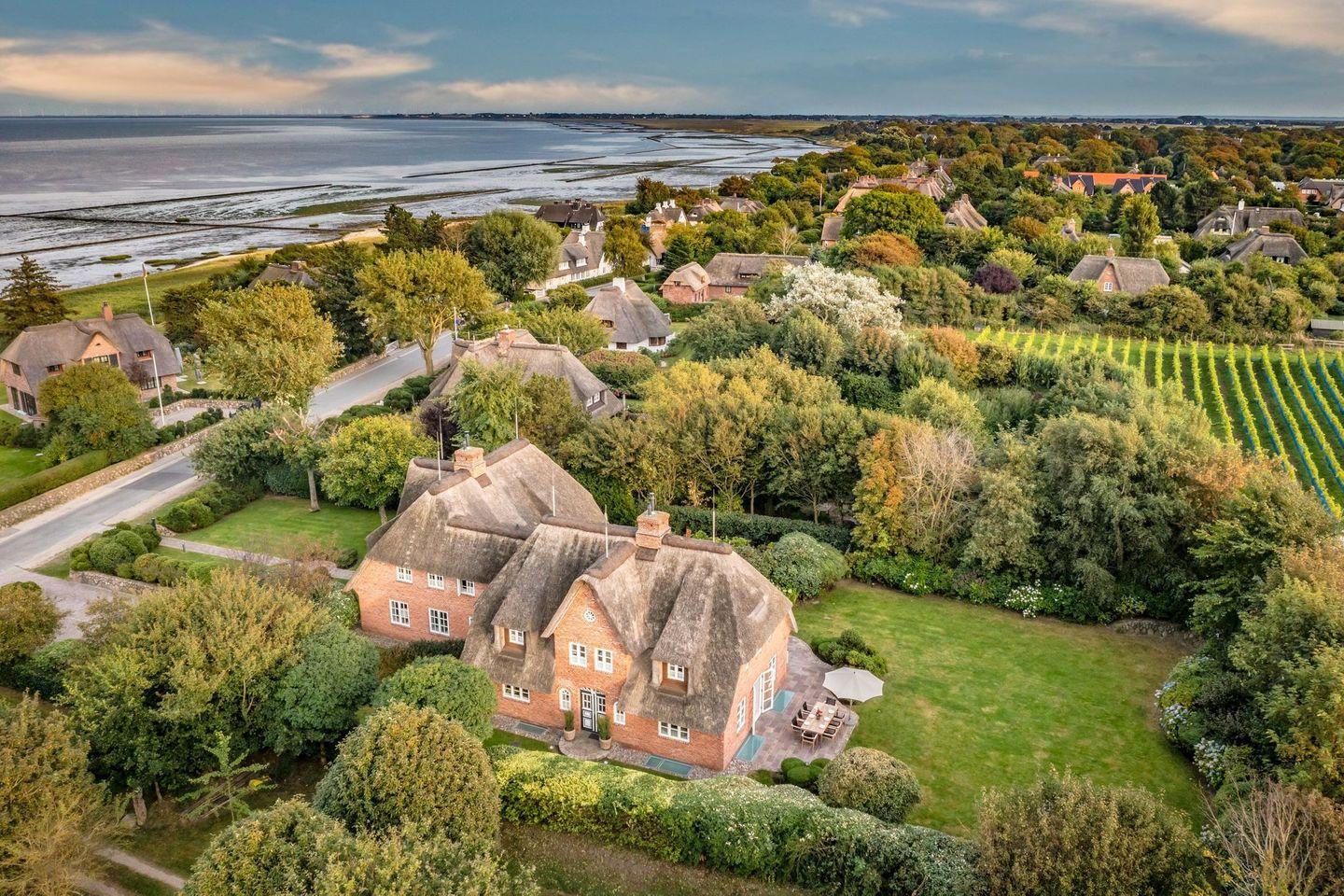 Das Haus ist hochwertig und exklusiv ausgestattet und von einem großzügigen Garten umgeben. Selbstverständlich ist dieses Haus mit 5 Sternen des DTV klassifiziert. Diese mit Reet gedeckte Doppelhaushälfte mit Einzelhaus-Charakter liegt fußläufig zur Keitumer St. Severin und in unmittelbarer Nähe zum Wattenmeer. Das helle und großzügige Objekt über drei Ebenen (EG, OG, Souterrain) ist ca. 260 m² groß und bietet zwei bis acht Personen ausreichend Platz. Das geräumige und hochwertige Haus liegt auf einem insgesamt 1.000 m² Grundstück südlich der St. Severin Kirche in Keitum. Das exklusive Doppelhaus wurde mit aufgearbeiteten Ziegelsteinen von 1886 erbaut. Die Räumlichkeiten im Erdgeschoß sind mit großflächigen sehr hochwertigen Natur Limestone ausgelegt, im Obergeschoß liegen Echtholzeichendielen, das gesamt Souterrain und die Bäder sind ebenfalls mit Limestone verlegt. Im Erdgeschoss und im Souterrain ist jeweils eine Fussbodenerwärmung integriert, zusätzlich sind auch Heizkonvektoren in allen Räumen angebracht. Auf allen Ebenen finden Sie hochwertige Tischlereinbauten. Darüber hinaus bietet das Haus jeglichen Komfort wie Sauna mit Ruheraum, Gaskamin, Flat-TV's ( streamingfähig) mit Soundbar, WLAN (High-Speed Internet), alle Schlafzimmer und Wohnzimmer mit Flachbildschirmen, Alarmanlage, Geschirrspüler, Mikrowelle, Backofen, Kühlschrank, Nespresso Kaffeemaschine, Induktionsherd, Safe, Hauswirtschaftsraum mit Waschmaschine und Trockner und zwei Pkw-Stellplätze. Bademäntel sind für Sie als unser Gast in diesem Domizil kostenfrei. Die Betten sind jeweils 1,80 x 2,00 m mit durchgängiger Matratze. Das Haus ist von einem großzügigen gepflegten Garten mit zwei Terrassen und Friesenwälle umgeben. Das Haus ist ausschließlich für Nichtraucher (auf der Terrasse wäre es erlaubt).