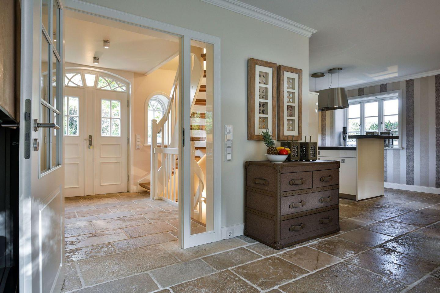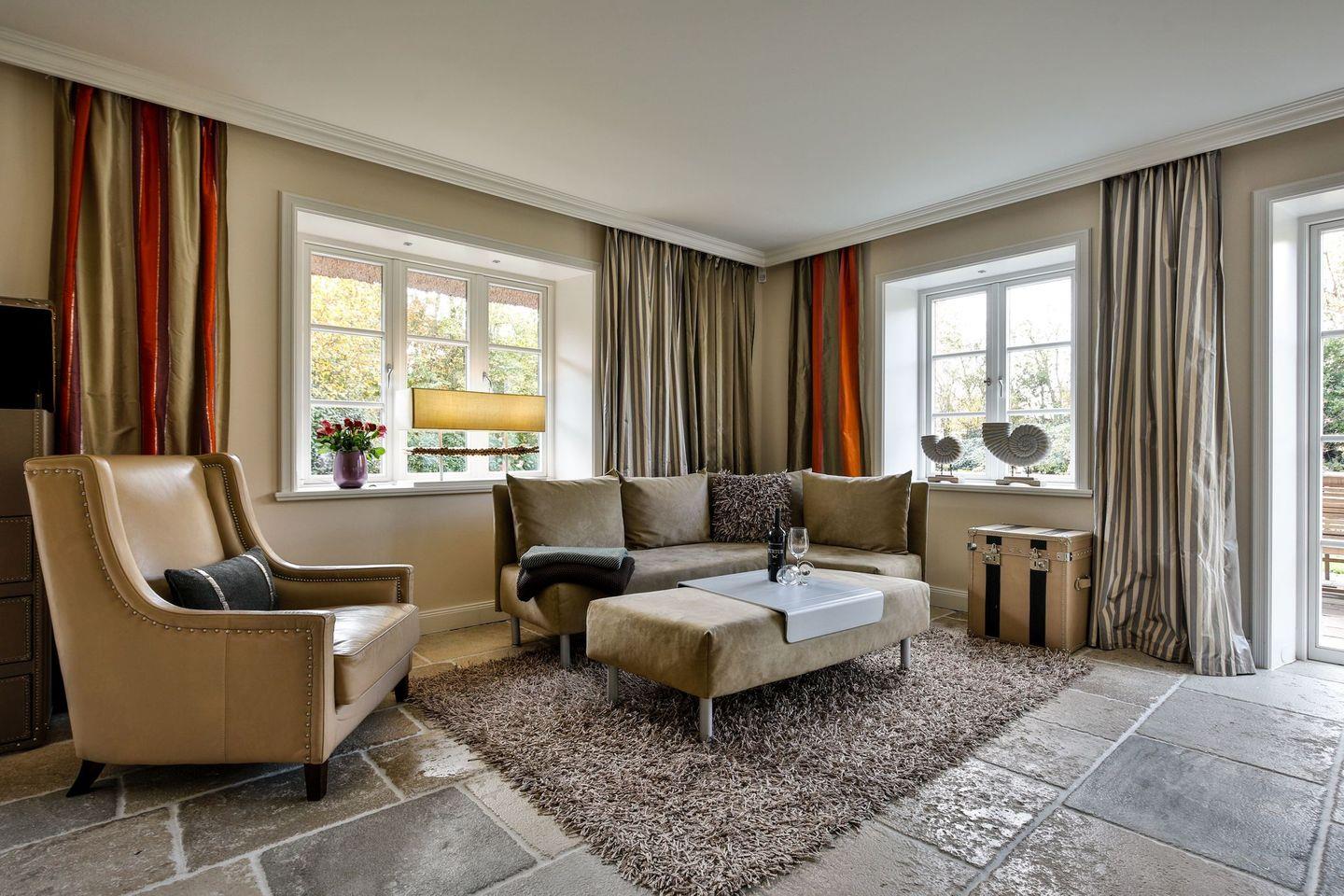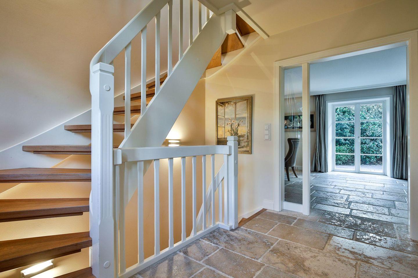 Das Haus ist hochwertig und exklusiv ausgestattet und von einem großzügigen Garten umgeben. Selbstverständlich ist dieses Haus mit 5 Sternen des DTV klassifiziert. Diese mit Reet gedeckte Doppelhaushälfte mit Einzelhaus-Charakter liegt fußläufig zur Keitumer St. Severin und in unmittelbarer Nähe zum Wattenmeer. Das helle und großzügige Objekt über drei Ebenen (EG, OG, Souterrain) ist ca. 260 m² groß und bietet zwei bis acht Personen ausreichend Platz. Das geräumige und hochwertige Haus liegt auf einem insgesamt 1.000 m² Grundstück südlich der St. Severin Kirche in Keitum. Das exklusive Doppelhaus wurde mit aufgearbeiteten Ziegelsteinen von 1886 erbaut. Die Räumlichkeiten im Erdgeschoß sind mit großflächigen sehr hochwertigen Natur Limestone ausgelegt, im Obergeschoß liegen Echtholzeichendielen, das gesamt Souterrain und die Bäder sind ebenfalls mit Limestone verlegt. Im Erdgeschoss und im Souterrain ist jeweils eine Fussbodenerwärmung integriert, zusätzlich sind auch Heizkonvektoren in allen Räumen angebracht. Auf allen Ebenen finden Sie hochwertige Tischlereinbauten. Darüber hinaus bietet das Haus jeglichen Komfort wie Sauna mit Ruheraum, Gaskamin, Flat-TV's ( streamingfähig) mit Soundbar, WLAN (High-Speed Internet), alle Schlafzimmer und Wohnzimmer mit Flachbildschirmen, Alarmanlage, Geschirrspüler, Mikrowelle, Backofen, Kühlschrank, Nespresso Kaffeemaschine, Induktionsherd, Safe, Hauswirtschaftsraum mit Waschmaschine und Trockner und zwei Pkw-Stellplätze. Bademäntel sind für Sie als unser Gast in diesem Domizil kostenfrei. Die Betten sind jeweils 1,80 x 2,00 m mit durchgängiger Matratze. Das Haus ist von einem großzügigen gepflegten Garten mit zwei Terrassen und Friesenwälle umgeben. Das Haus ist ausschließlich für Nichtraucher (auf der Terrasse wäre es erlaubt).