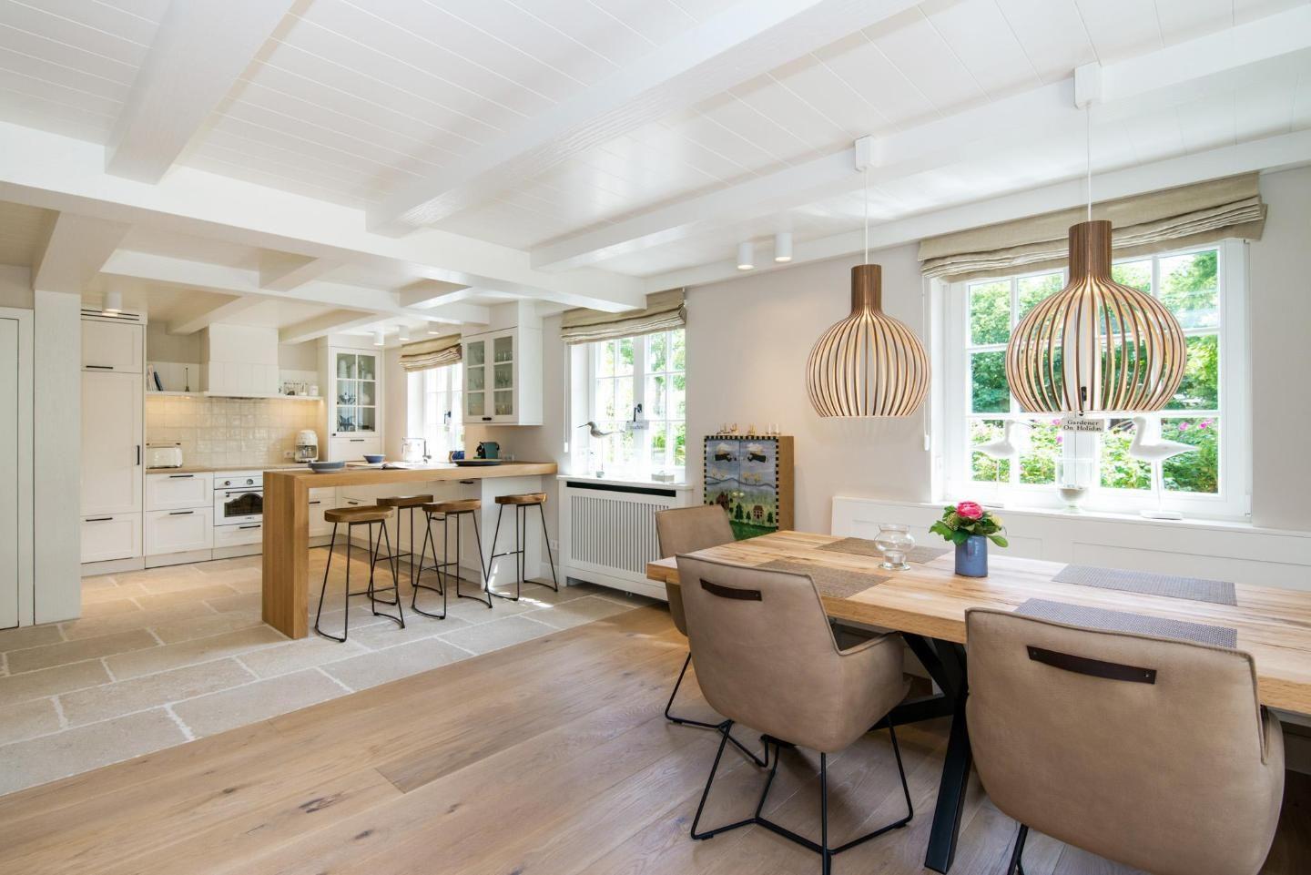 • Offene Küche zum Wohnraum mit einem Bartresen getrennt, mit 4 Barhockern, Geschirrspüler, Mikrowelle und Kaffee- und Nespresso-Maschine; hochwertig bestückt
