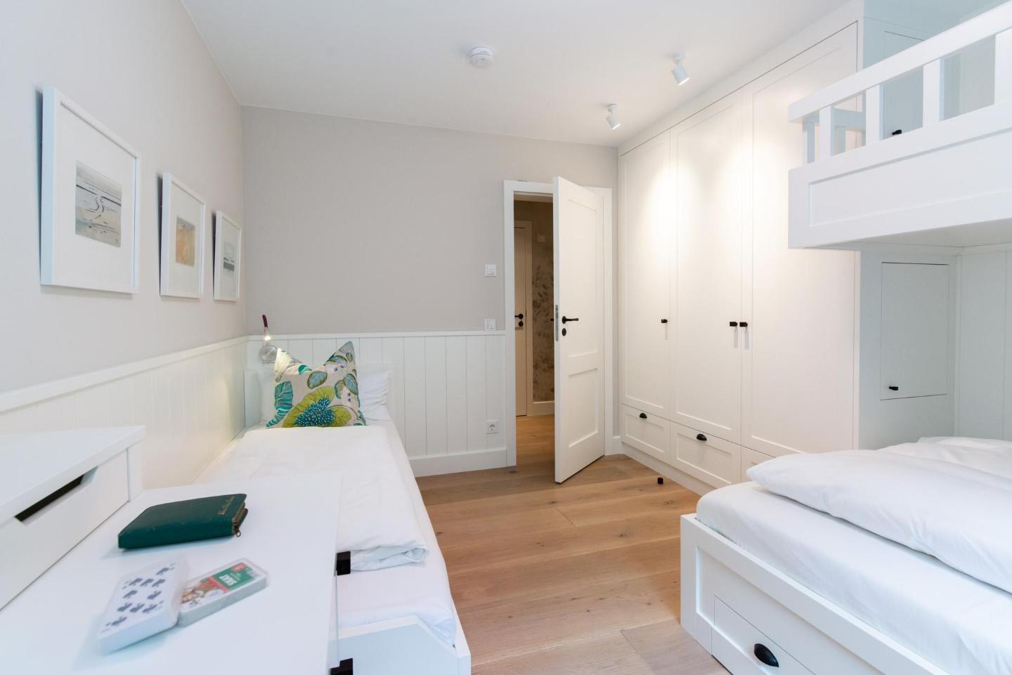 • Raum 2: Kinderzimmer mit 2,5 Betten: eingebautes Doppelstockbett (unten 140 x 200 cm - oben 90 x 200 cm; oberes Bett zählt als 0,5 Bett) mit „eingebauten Geheimfächern“, separates Einzelbett (80 x 200 cm) sowie Einbauschreibtisch und -schrank