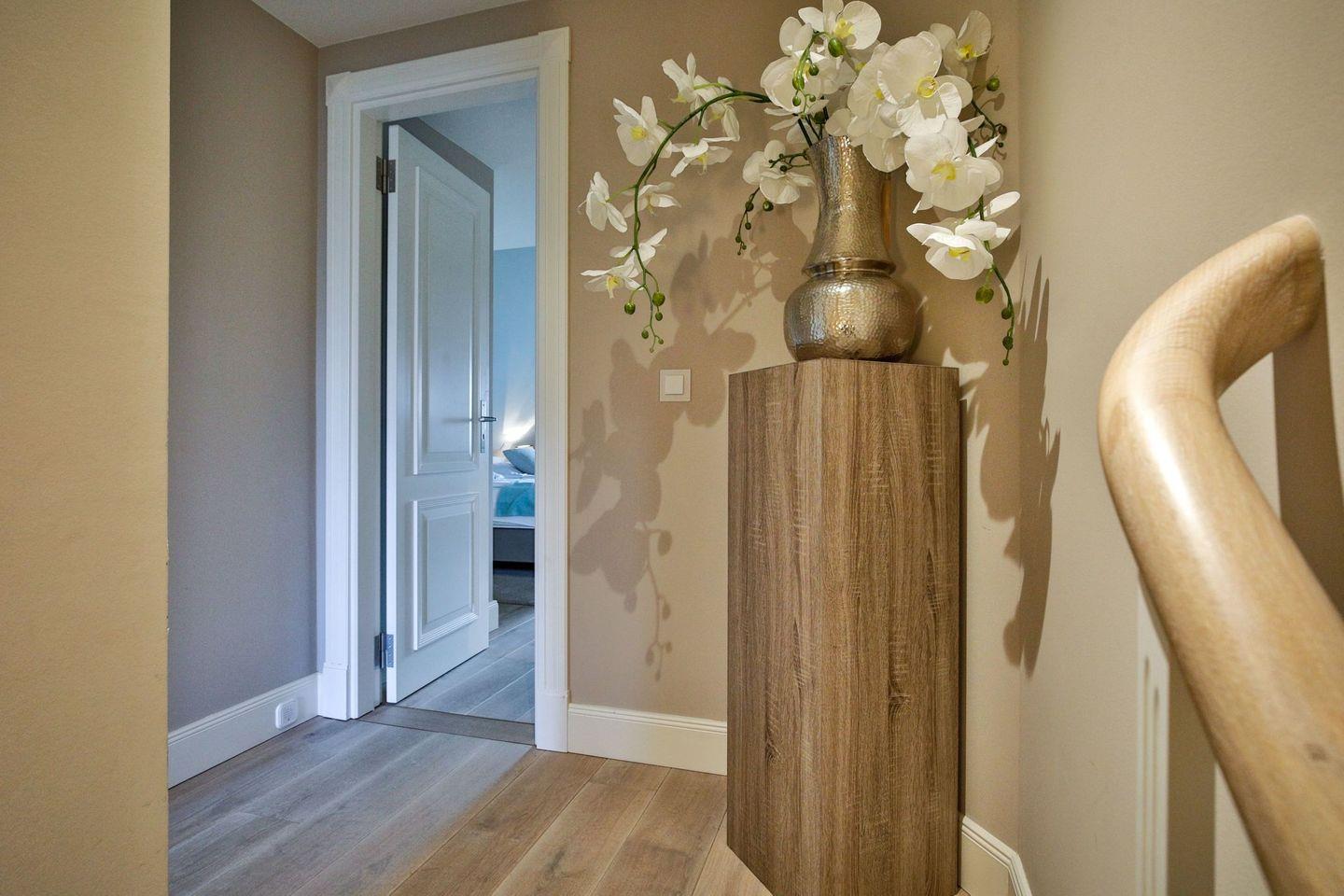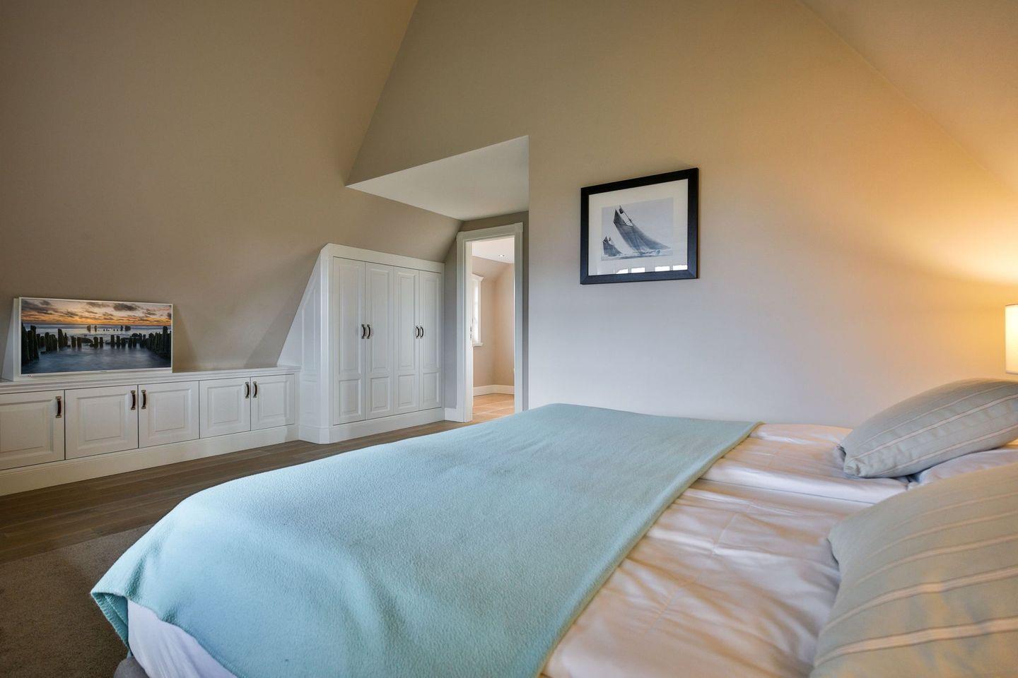 Das Haus ist hochwertig und exklusiv ausgestattet und von einem großzügigen Garten mit bepflanzten Friesenwällen umgeben. Selbstverständlich ist dieses Haus mit 5 Sternen des DTV klassifiziert. Das in 2014 fertiggestellte Haus wurde mit antiken Rotziegeln gemauert und ist von bepflanzten Friesenwällen und großzügiger Rasenfläche umrahmt. Das helle und großzügige Haus über drei Ebenen (EG, OG, Souterrain) ist ca. 234 m² groß und bietet zwei bis acht Personen ausreichend Platz. Dieses Haus lebt von seiner offenen und großzügigen Raumaufteilung. So wird nahezu das komplette Erdgeschoss genutzt für einen kombinierten Wohn- und Essraum mit Kamin und offener Küche. Die Schlafzimmer im Obergeschoss bekommen ihren besonderen Charakter durch die nach oben offenen Giebel. Im Souterrain lädt eine Sauna inkl. Ruheraum zum Entspannen ein. Die Räumlichkeiten im Erdgeschoß sind mit großflächigen sehr hochwertigen Natur Limestone ausgelegt, im Obergeschoß liegen Echtholzeichendielen, der gesamte Souterrain und die Bäder sind ebenfalls mit Limestone verlegt. Das gesamte Haus ist mit modernen und hochwertigen Interieur eingerichtet. Im Erdgeschoss und im Souterrain in den Bädern ist jeweils eine Fußbodenerwärmung integriert, zusätzlich sind auch Heizkonvektoren in allen Räumen angebracht. Auf allen Ebenen finden Sie hochwertige Tischlereinbauten. Darüber hinaus bietet das Haus jeglichen Komfort wie Sauna, Kamin, Flat-TV, W-LAN, alle Schlafzimmer und Wohnzimmer mit Flachbildschirmen, Alarmanlage, Geschirrspüler, Soda-Stream, Mikrowelle, Backofen, Kühlschrank, Induktionsherd, Hauswirtschaftsraum mit Waschmaschine und Trockner, Safe, zwei Pkw-Stellplätze. Kaminholz sowie Bademäntel sind für Sie als Gast inklusive und ebenfalls vor Ort im Domizil.