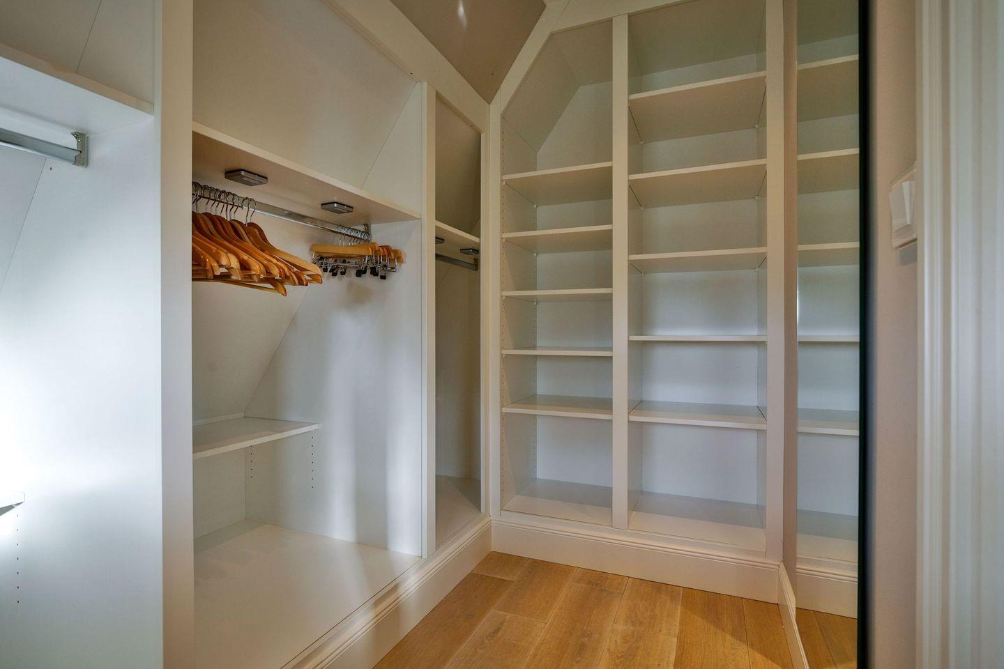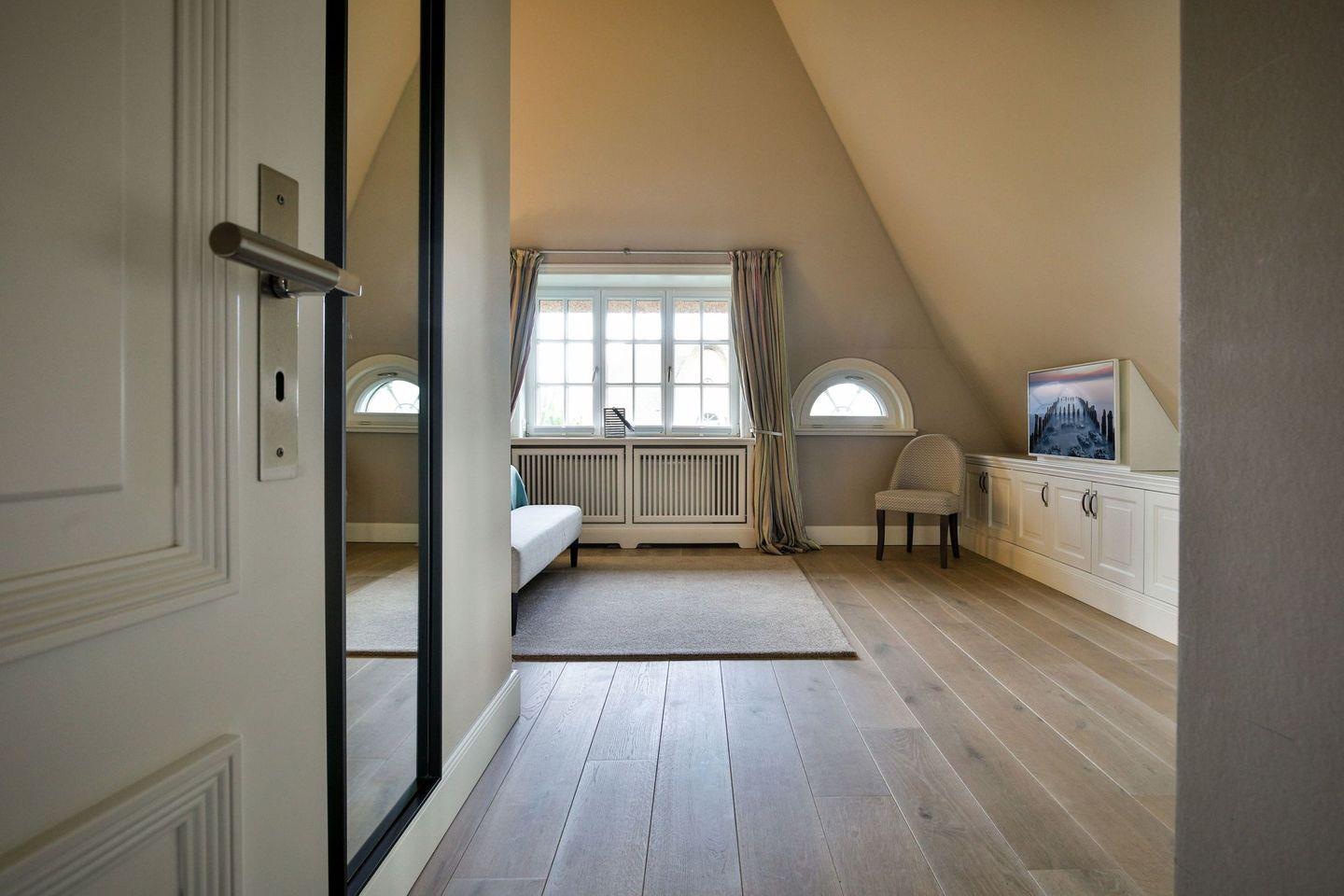 Schlafen 2: geräumiger Schlafraum mit Doppelbett, TV, kleines Ankleidezimmer mit Spiegel, nach oben offenem Giebel