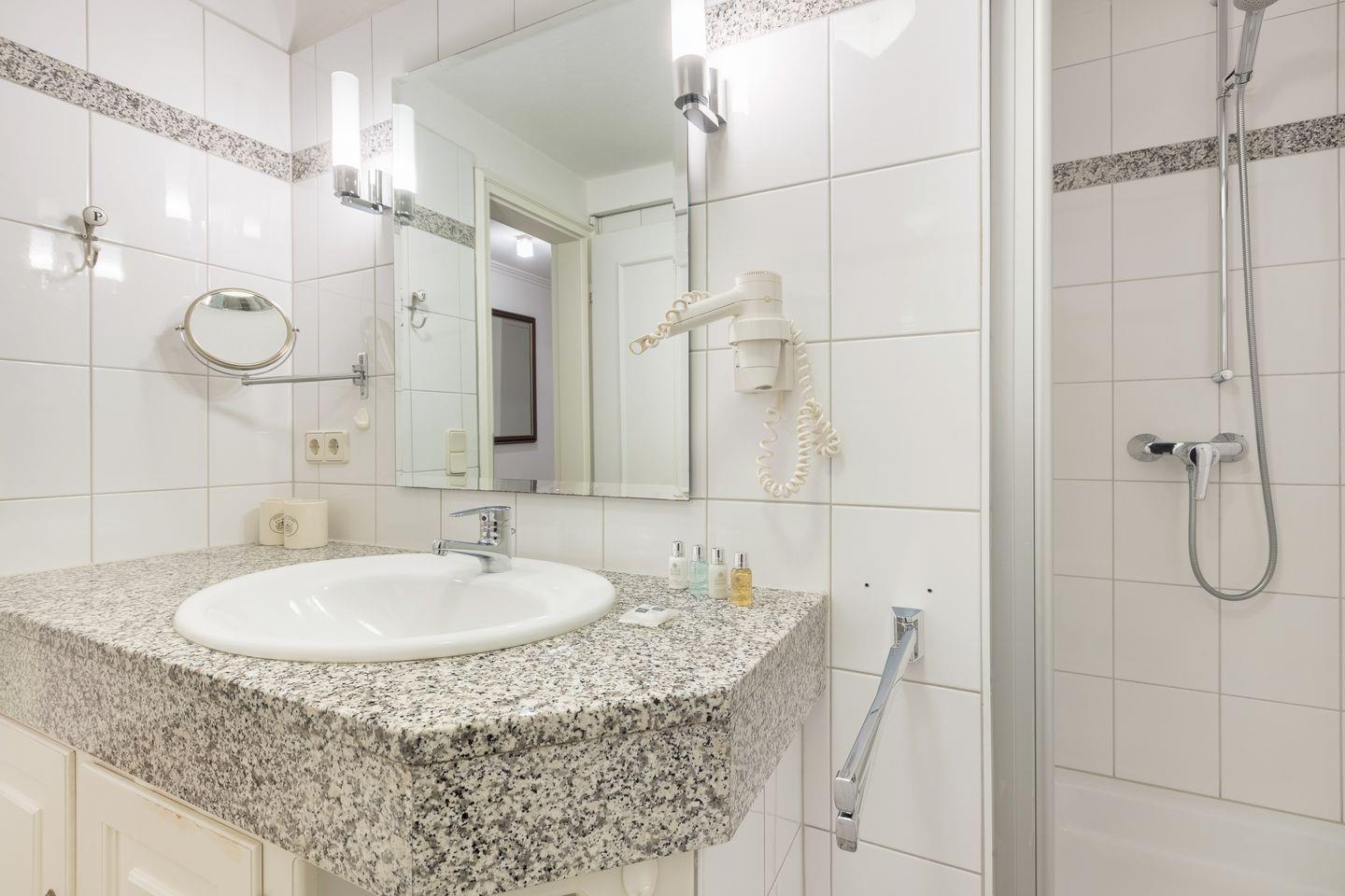 Badezimmer: helles Duschbad mit Einzelwaschtisch, Kosmetikspiegel und großem Spiegel