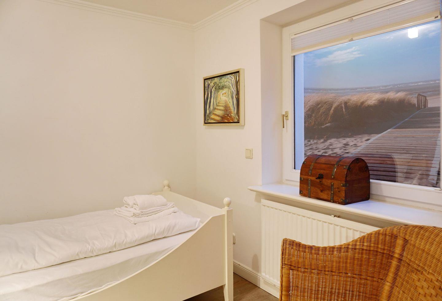 Schlafen 2: kleiner Schlafraum mit Einzelbett (80 x 200 cm, mit Fußteil) und kleinem Schreibplatz