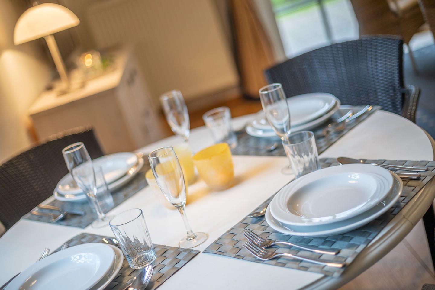 Im Erdgeschoss finden Sie einen offenen, hellen Wohnbereich, der mit gemütlicher Sofaecke, Esstisch sowie digitalen TV-Geräten (insgesamt zwei) zum Verweilen einlädt. Der angrenzende Essbereich sorgt für ein angenehmes Ambiente beim gemeinsamen Frühstück oder Abendessen.. Die offene Küche ist modern gestaltet und mit Induktionsherd, Kühlschrank, Geschirrspüler, Mikrowelle, Kaffeemaschine, Toaster sowie Wasserkocher vollständig eingerichtet.