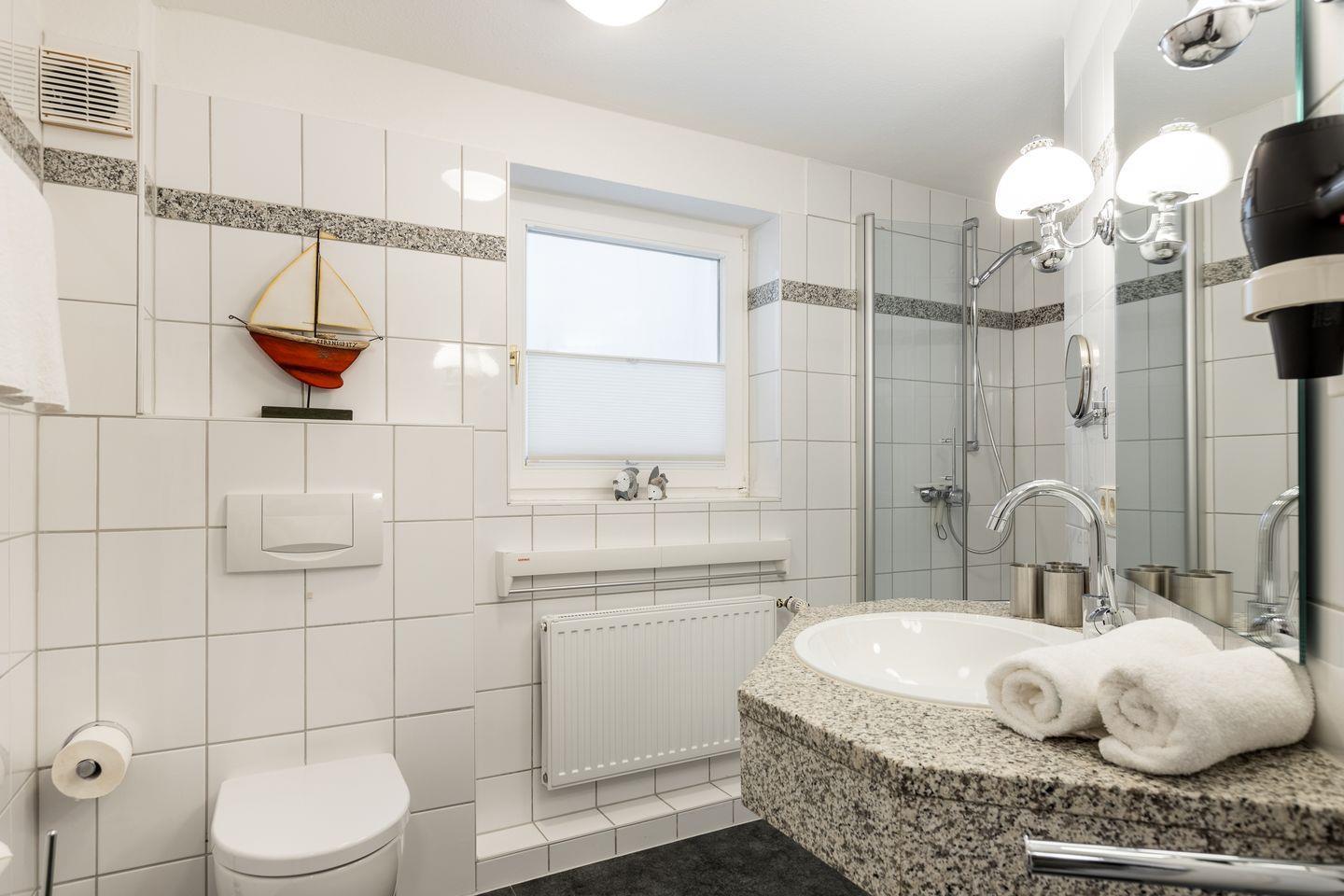 Das Badezimmer ist mit einer Dusche mit Badewanne, WC, Waschbecken, Kosmetikspiegel, Haartrockner sowie einer Grundausstattung an Seife und Shampoo ausgestattet. Bettwäsche und Handtücher sind ebenfalls inklusive, sodass Sie sich um nichts weiter kümmern müssen. Eine Garderobe sowie Spiegel im Eingangsbereich runden den hohen Wohnkomfort ab.