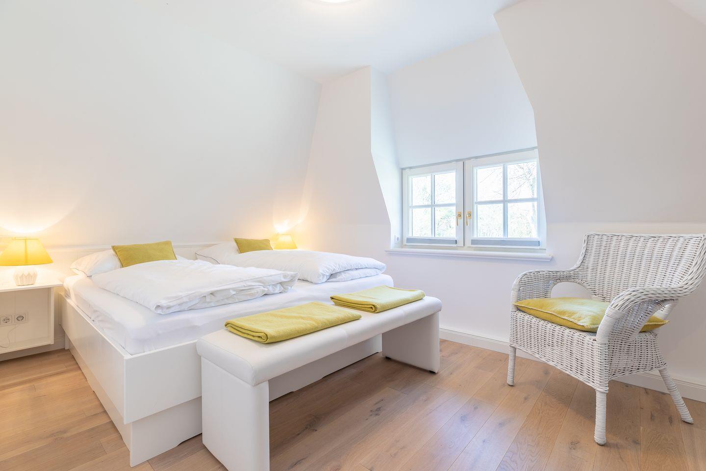 Schlafen 1: Schlafraum mit Doppelbett (2 Matratzen á 90 x 200 cm), Einbauschrank und TV