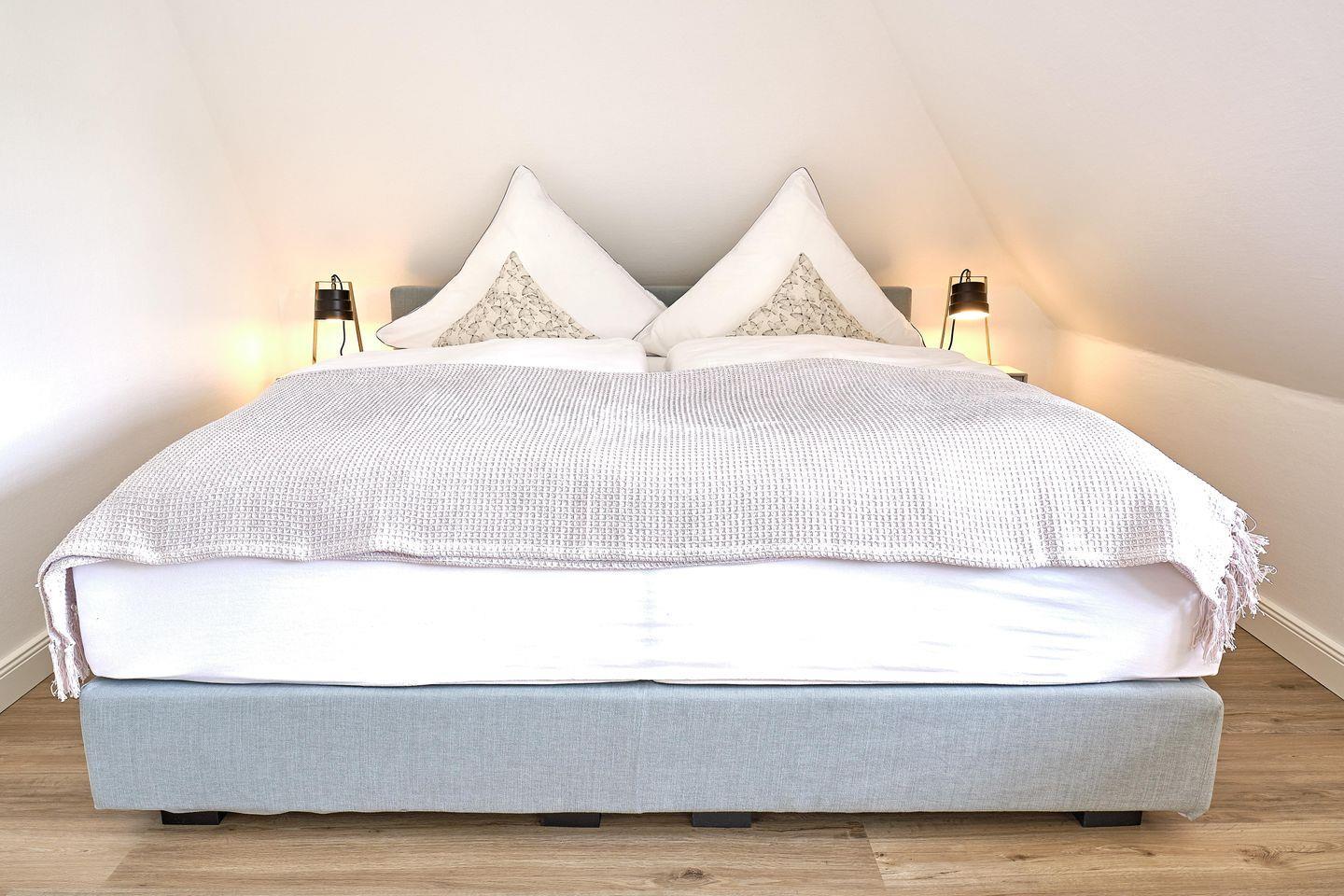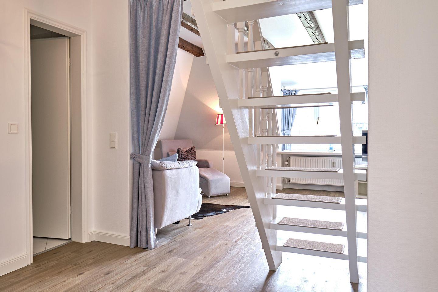 Schlafen 2: zusätzlicher Bereich im Spitzboden (durch eine offene Treppe zu Erreichen, ohne separate Tür) mit kleinen Einbauten sowie Schlafkammer mit zwei Einbaubetten