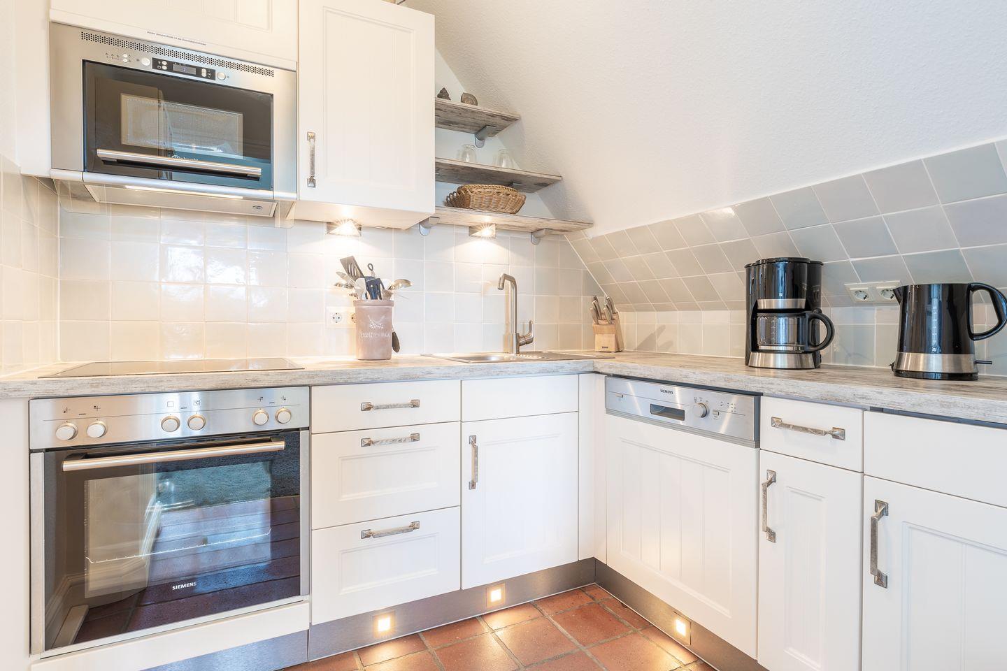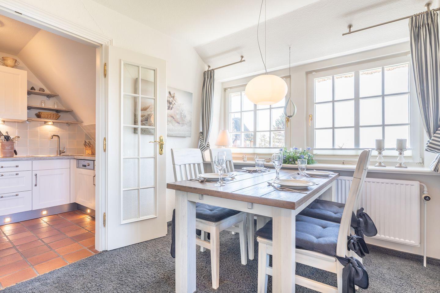 Die hier vorgestellte Ferienwohnung im Obergeschoß und ausgebautem Dachgeschoß in Nordwestlage ist ca. 65 m² groß und bietet zwei bis vier Personen Platz. Das reetgedeckte Haus liegt ca. fünf Gehminuten vom Wattenmeer entfernt. Die Einrichtung ist sehr gepflegt und gemütlich. Die Wohnung verfügt über Komfort wie zwei Flat-TV, DVD, Stereoanlage mit CD, Telefon, WLAN, Geschirrspüler, Kaffeepadmaschine "Dolce-Gusto", Mikrowelle mit integrierter Dunstabzugshaube, Backofen und Waschtrockner. Zur Wohnung gehört keine Gartennutzung.