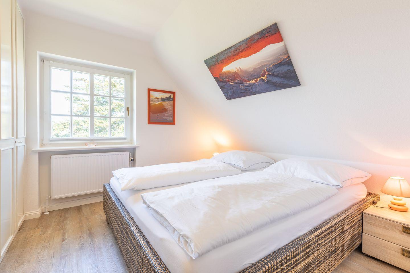 Schlafen 1: Schlafraum mit Doppelbett (180 x 200 cm, ohne Fußteil) und Einbauschrank