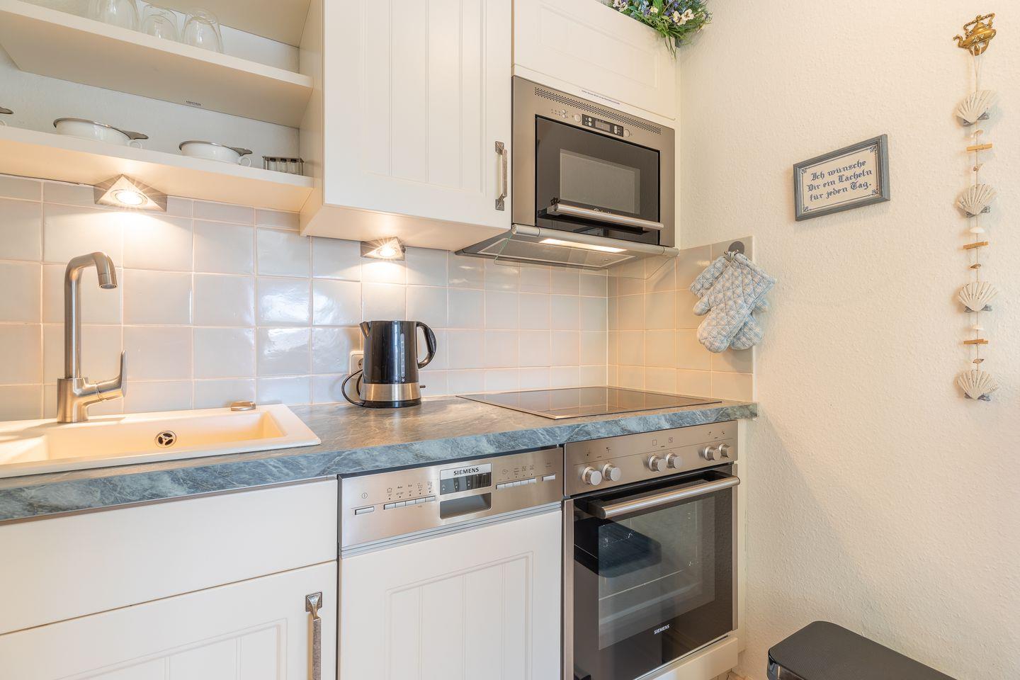 Küche (NEU): durch Flügeltüren trennbare moderne Einbauküche mit Backofen, Geschirrspüler, Cerankochfeld, Mikrowelle etc.