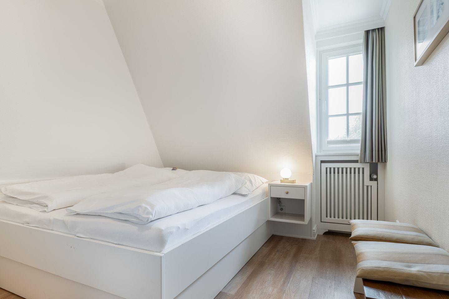 Schlafen 3: Schlafraum mit Einzelbett (90 x 190 cm), Schrank und Kommode sowie kleinem Arbeitsplatz am Fenster