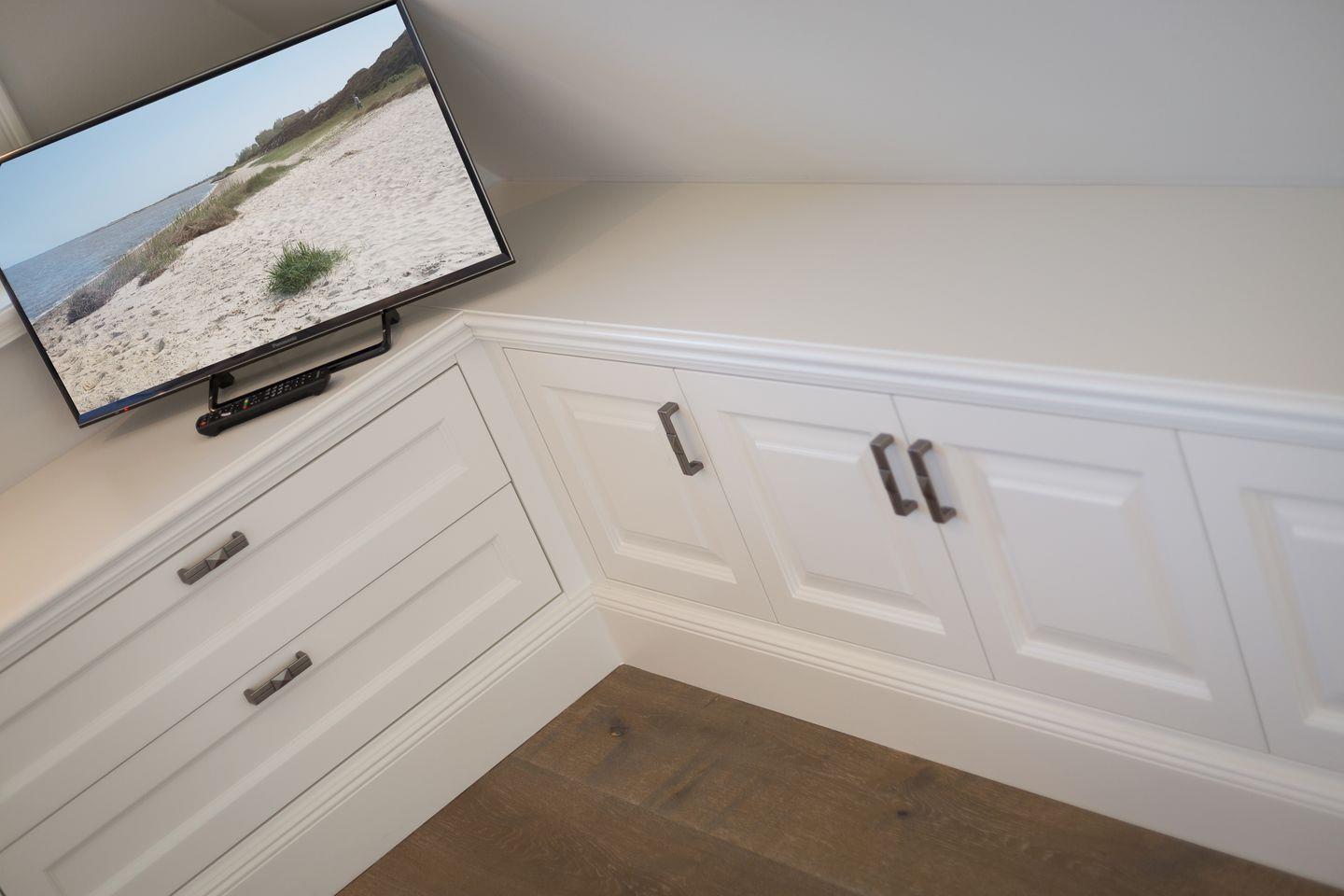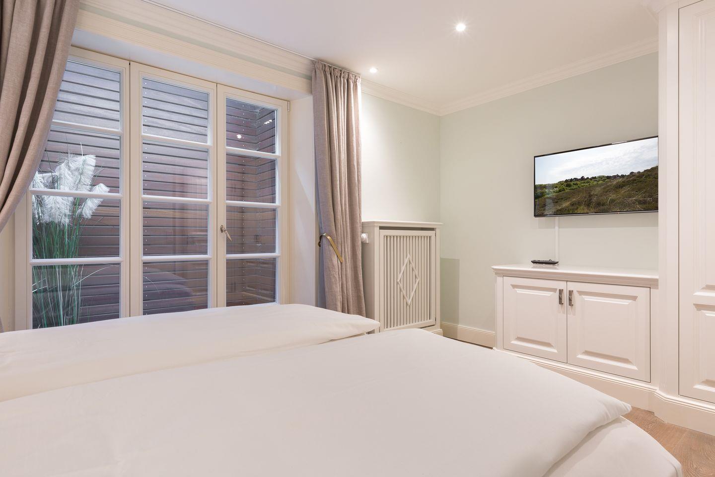Schlafen 4: heller Schlafraum mit Doppelbett und Einbauschränke, Flat-TV