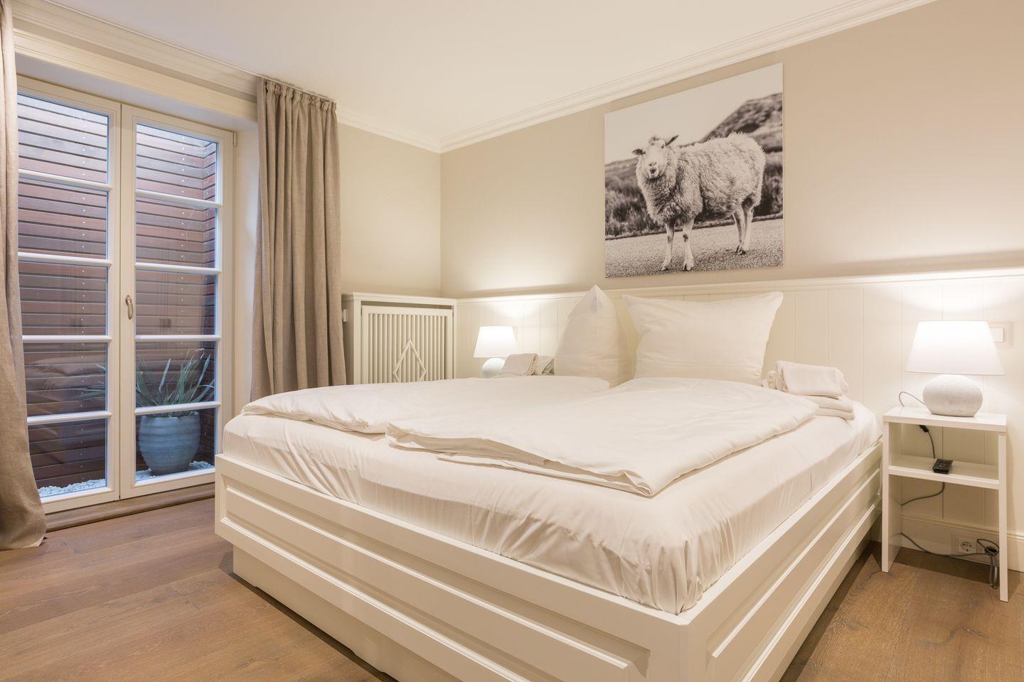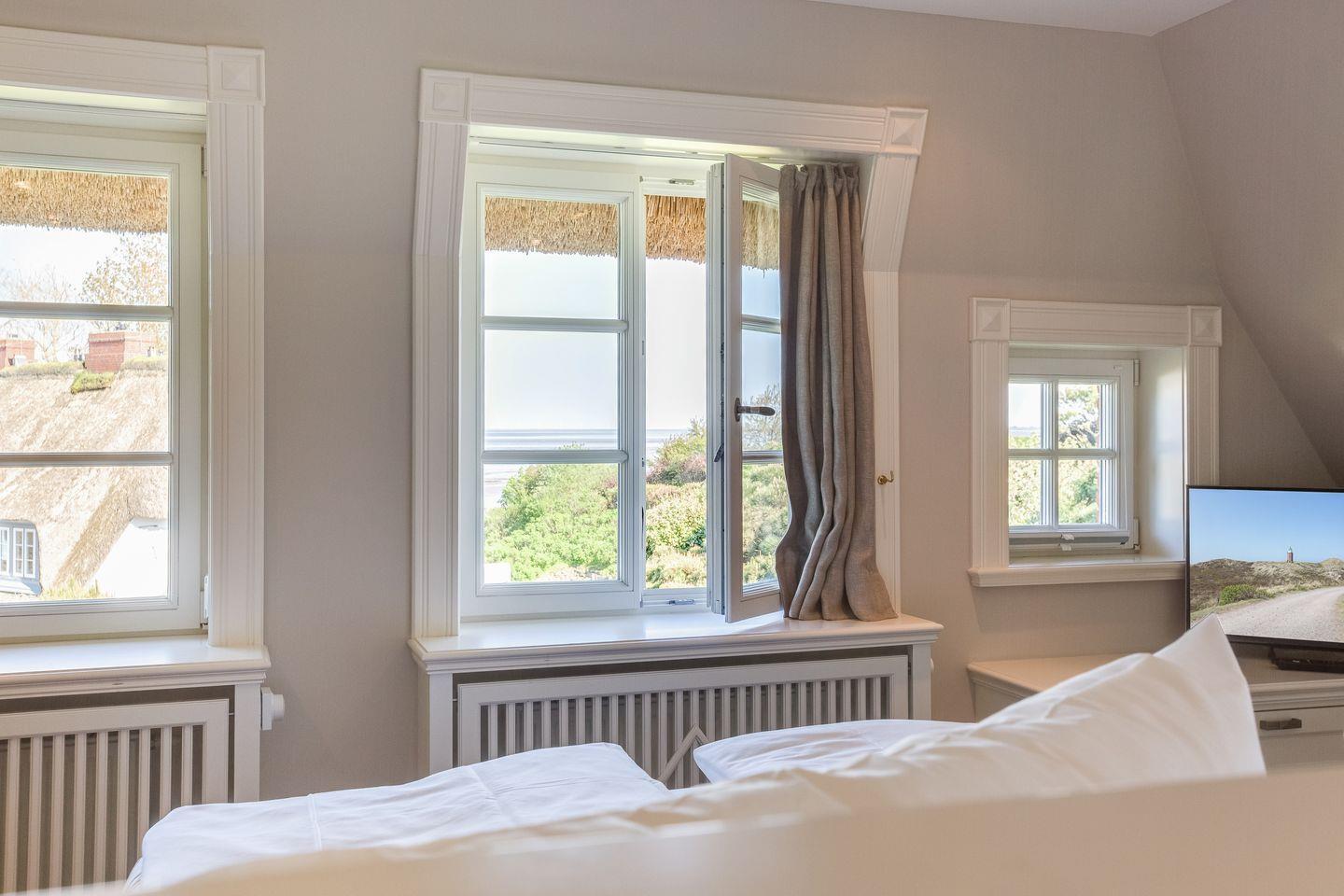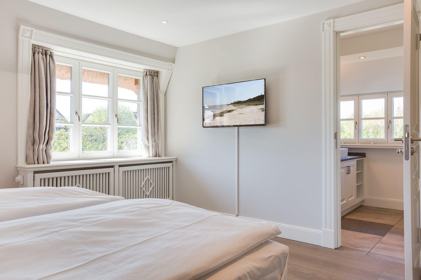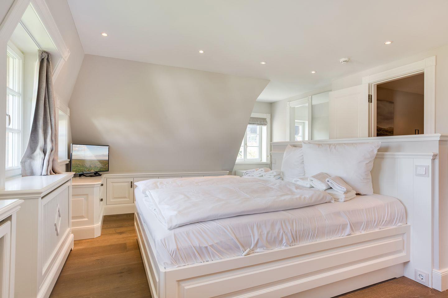 Schlafen 1: Masterschlafraum mit Doppelbett und einmaligen Blick zum Wattenmeer, kleiner Leseecke, Einbauschränke und Flat-TV sowie kleinem Ankleidezimmer