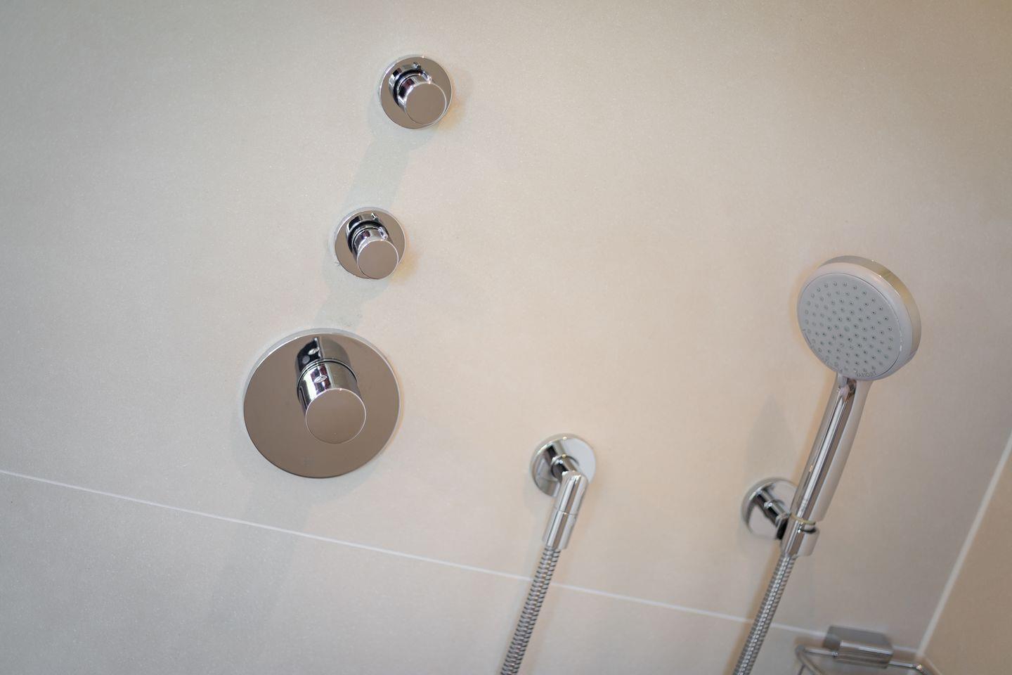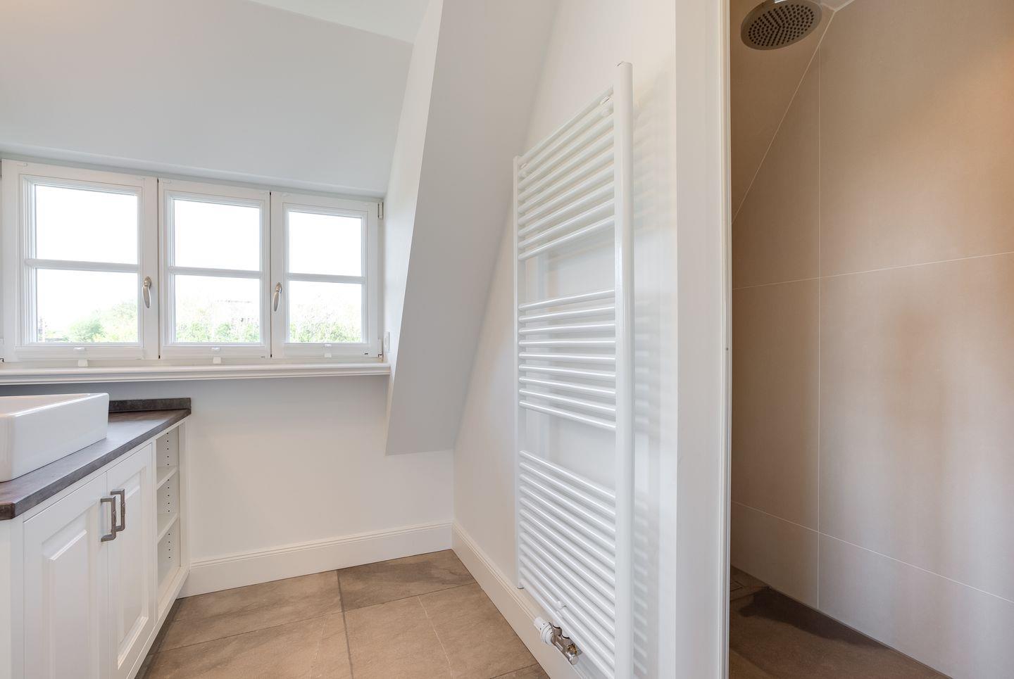 Bad 4: helles Duschbad mit Einzelwaschtisch und Spiegel sowie Handtuchwärmer