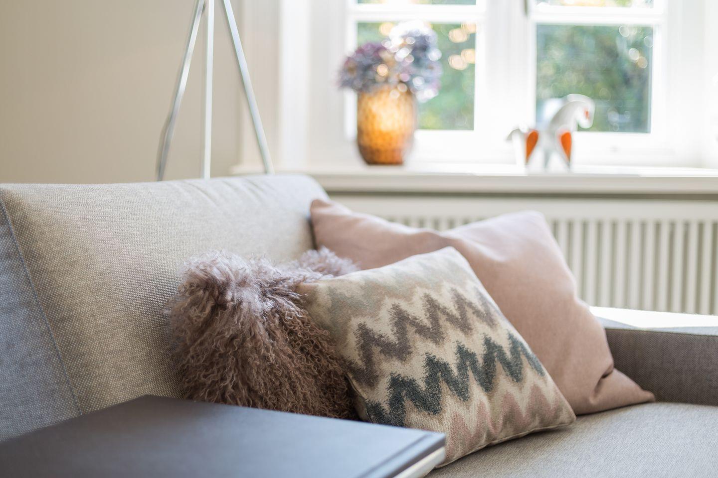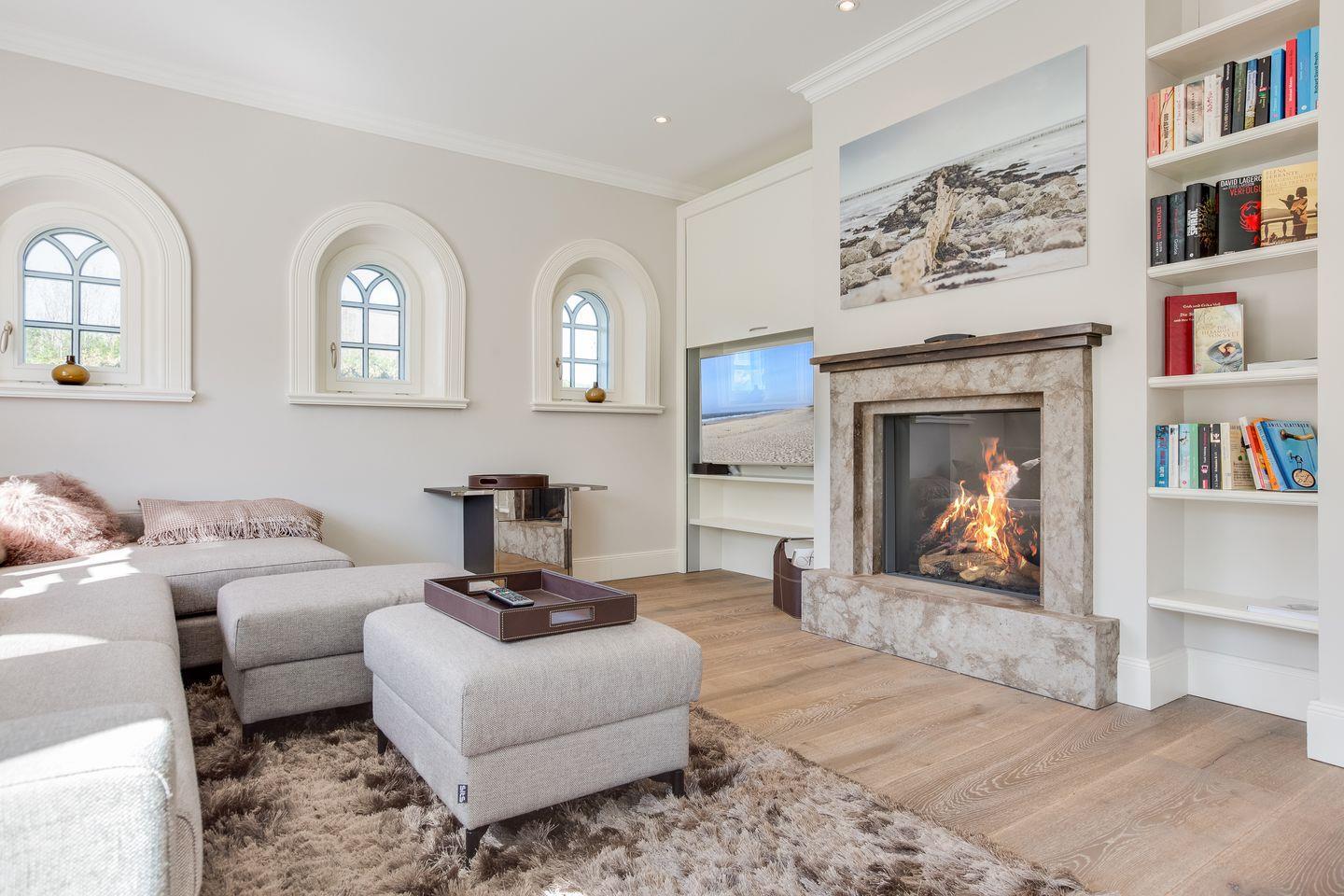 Wohnen: geräumiger Wohnbereich mit kleiner Leseecke sowie großer Sitzecke und dekorativen Gaskamin