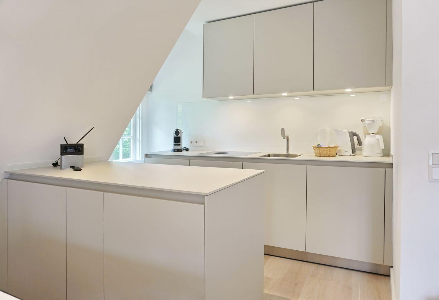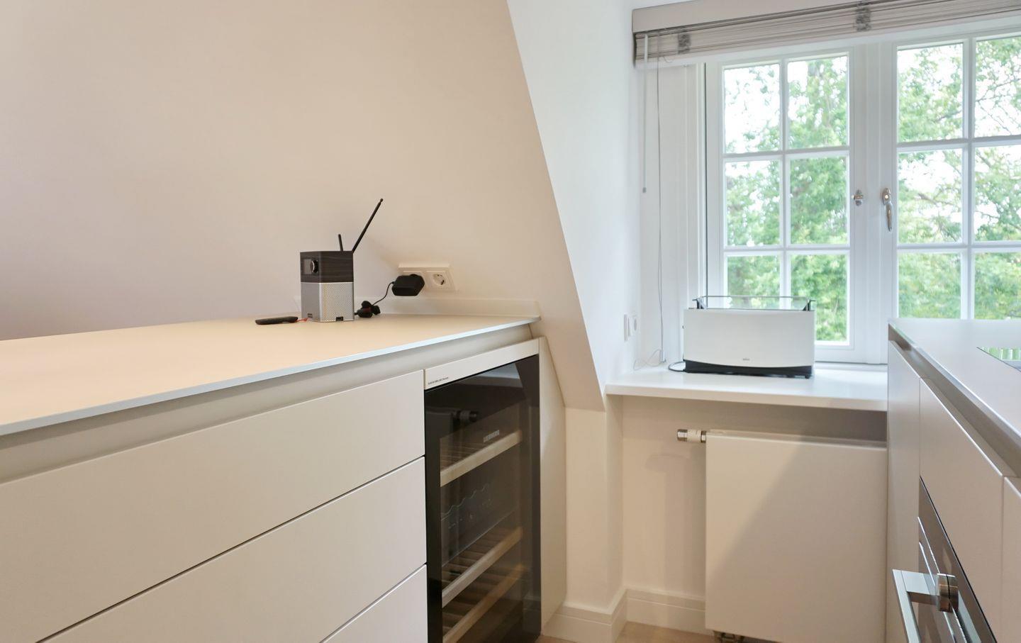 Küche: moderne Bulthaup Einbauküche mit Induktionskochfeld, Backofen mit Mikrowelle, Weinkühlschrank, Geschirrspüler, Nespresso Kaffeemaschine, Wasserkocher, Toaster.