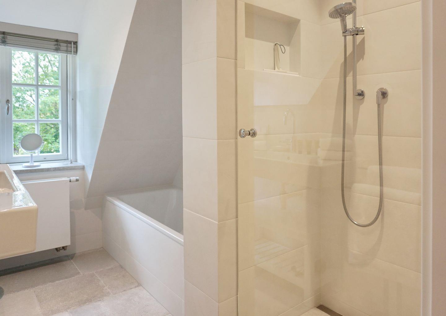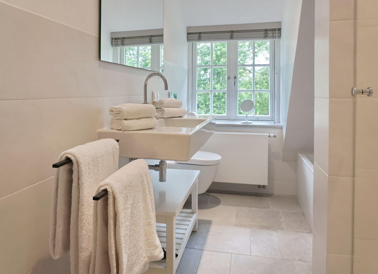 Bad 1: helles Badezimmer mit Waschtisch, WC, Badewanne und Dusche