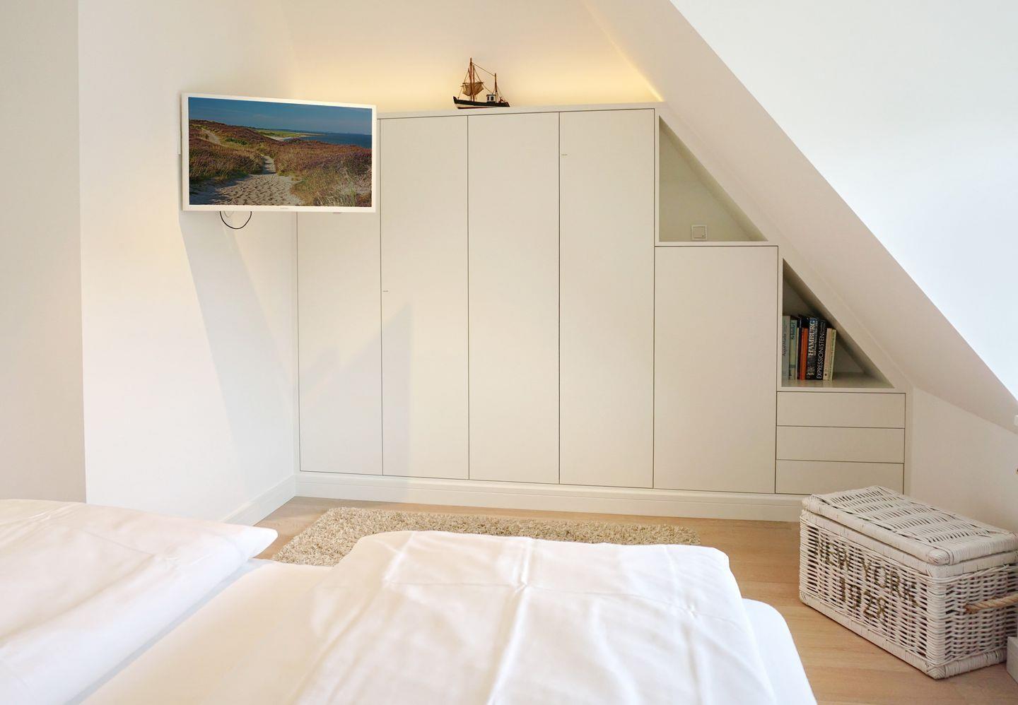 Schlafen: Schlafraum mit Schramm Boxspringbett (180x200, 2 getrennte Matratzen ), großem Einbauschrank ( mit Innenbeleuchtung ) und einem Flat-TV