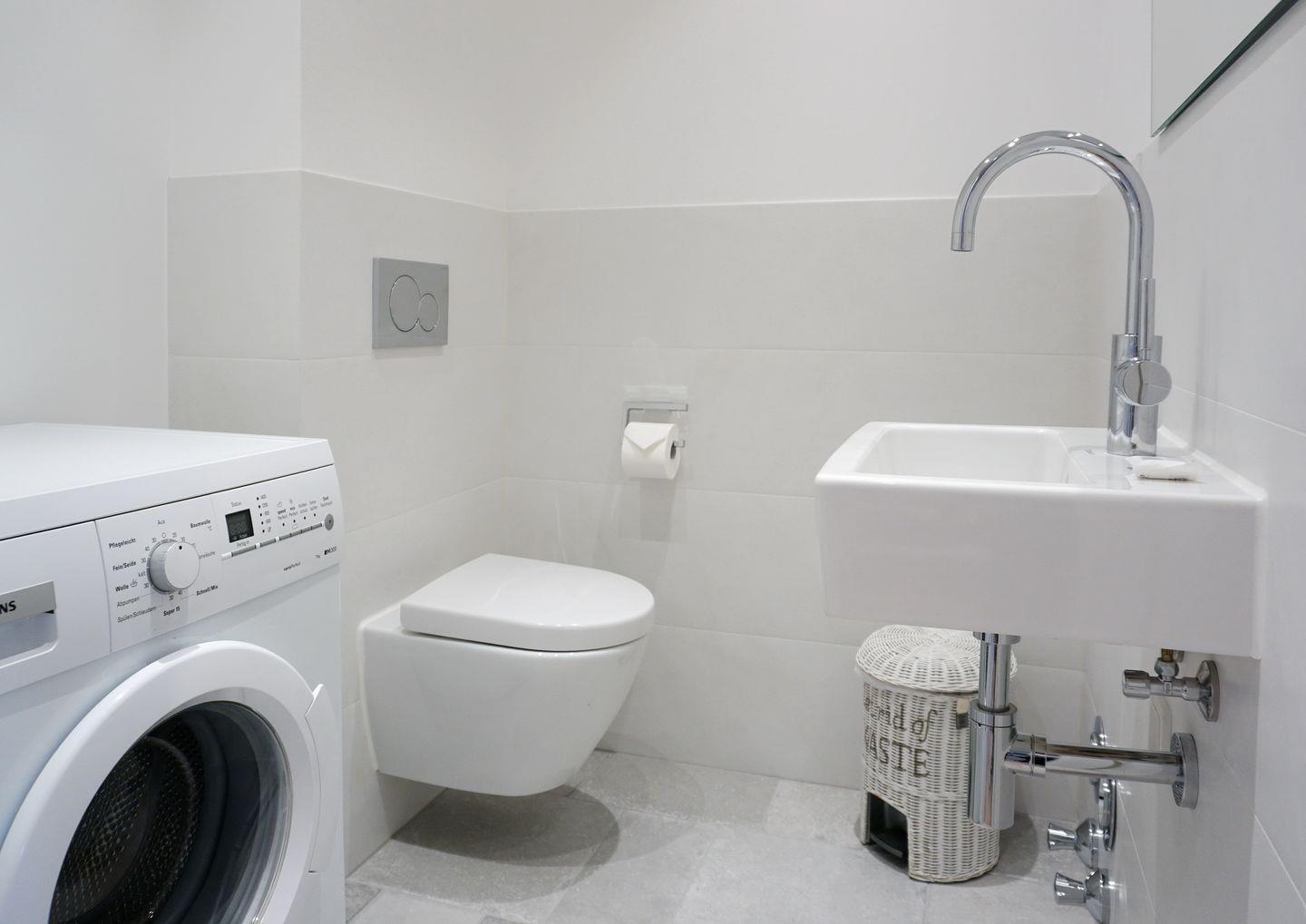 Gäste WC mit Handwaschbecken, Spiegel und Waschmaschine