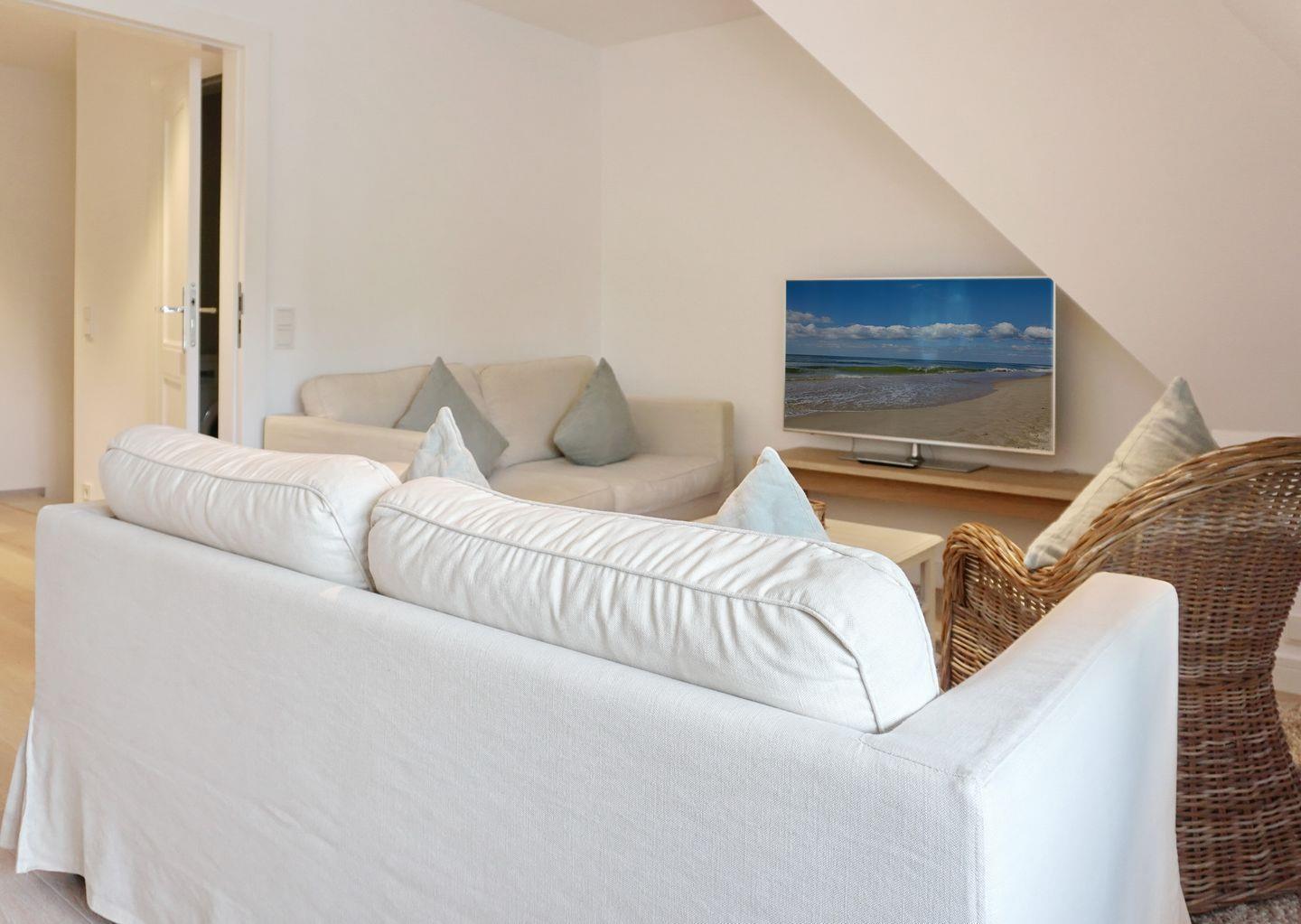 Wohn-/Essbereich: großes Wohnzimmer mit zwei 2-sitzigen Couchen einem Korbsessel und Flat-TV; Esstisch mit vier Stühlen