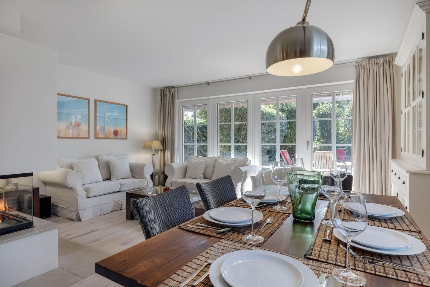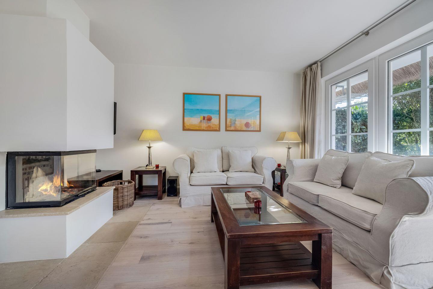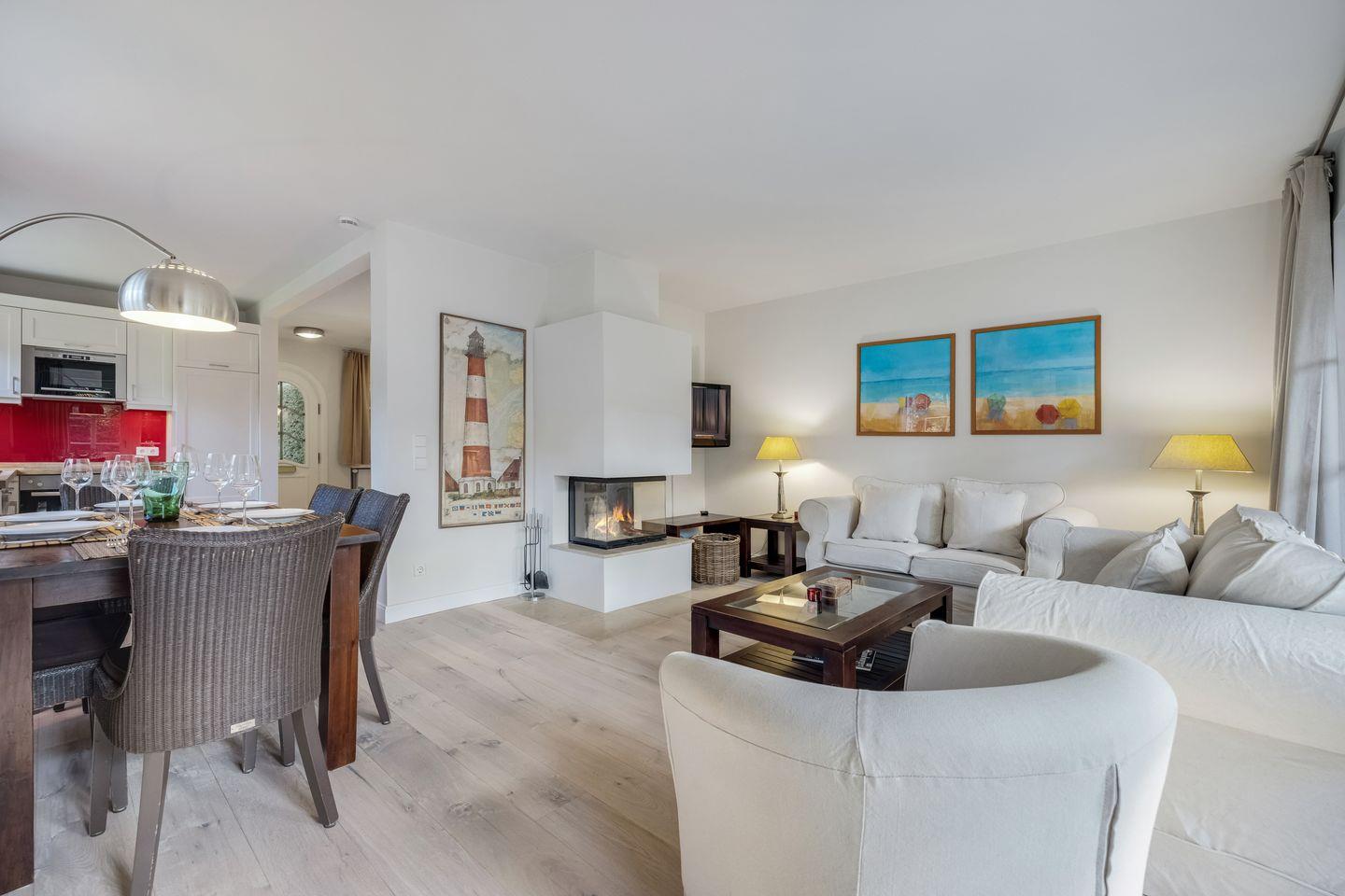 Wohn-/Essbereich: Wohnraum mit heller Sitzgarnitur bestehend aus zwei 2er-Couchen und einem Sessel, Kamin und Plasma-TV mit Stereoanlage (DVD etc.), zur offenen Küche steht der eckige Esstisch mit sechs Stühlen